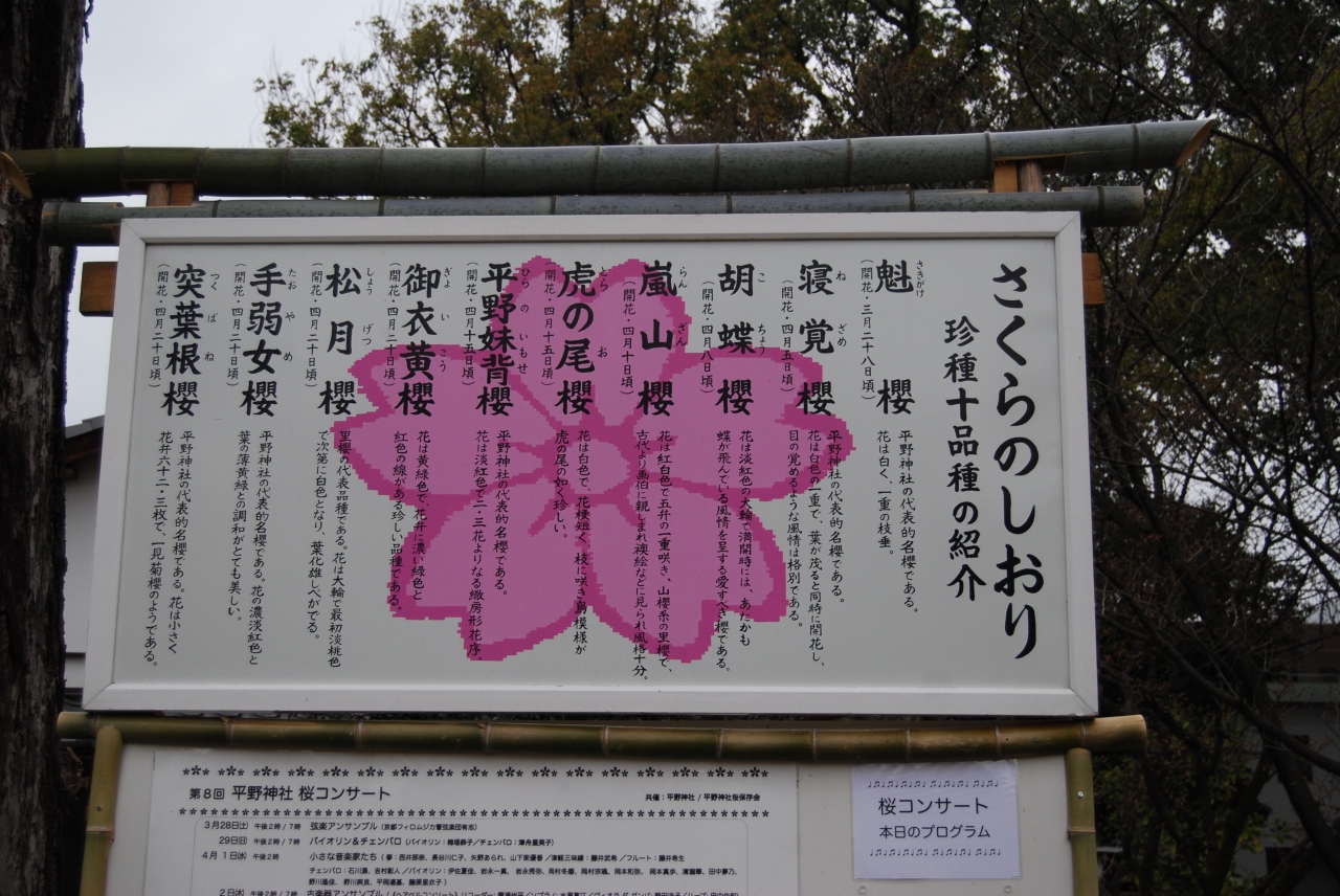 平野神社には原木の桜など珍種も多く、その種類は約50種。