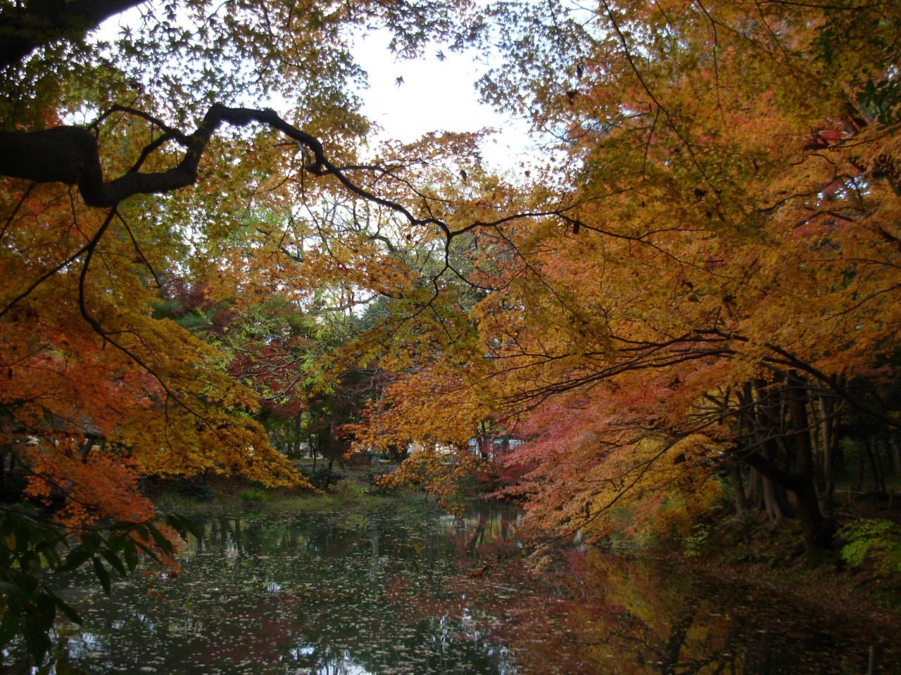 お寺の紅葉とちがって、でも池に反射したりで絵になる