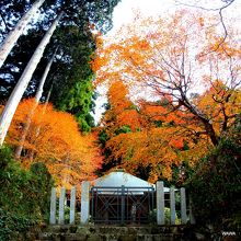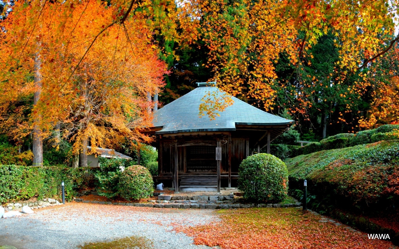 大原の勝林院と三千院の間に屋根のカーブが素敵な御堂があります。入場料はかかりませんが、周囲の柵から中には入れませんが、正面や右側から見ることが出来るので、背景の紅葉と小振りながら美しい御堂の景色を楽しむには十分です。人で溢れる三千院では事前のイメージとギャップを感じる方にお勧めの場所です。