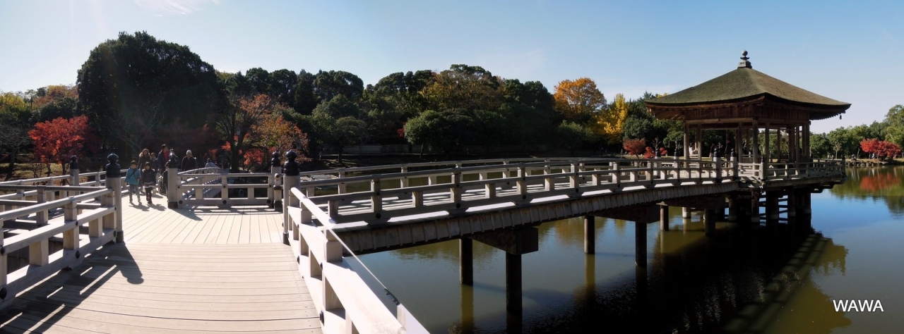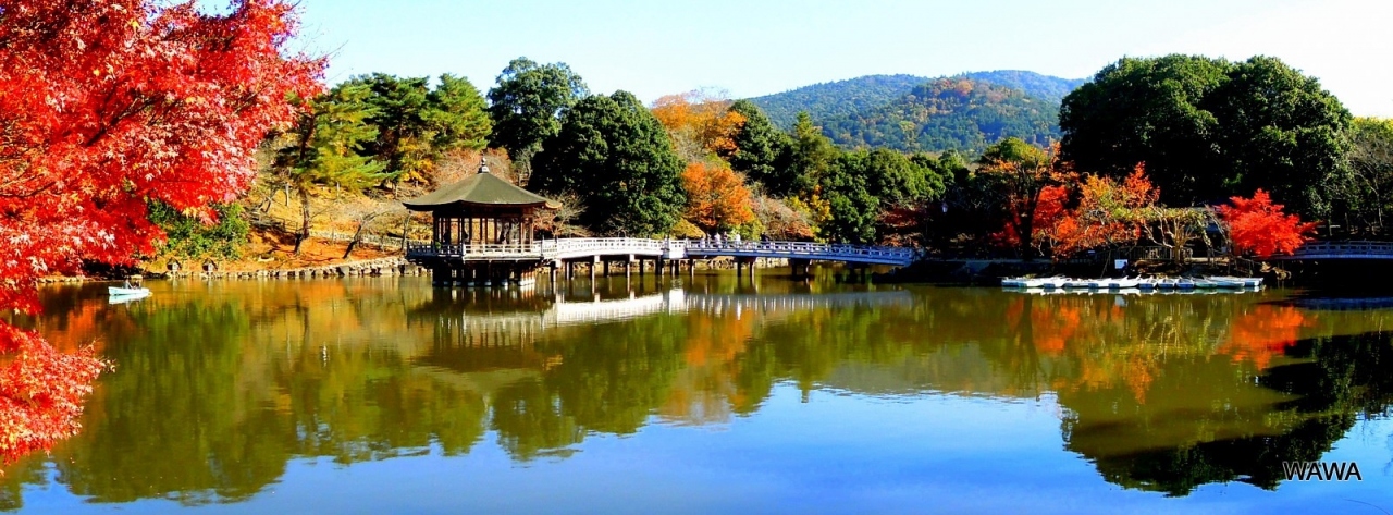 鹿のいる奈良公園の南部を春日大社方面に進むと、周囲を紅葉した丘に囲まれた鷺池に浮かぶ美しい御堂が浮見堂です。この御堂は凝った造りの橋で陸とつながり、橋の周囲には真赤に色づく楓やモミジが植えられていました。この日は快晴で風もなかったので湖面に映る丘の紅葉も楽しめました。