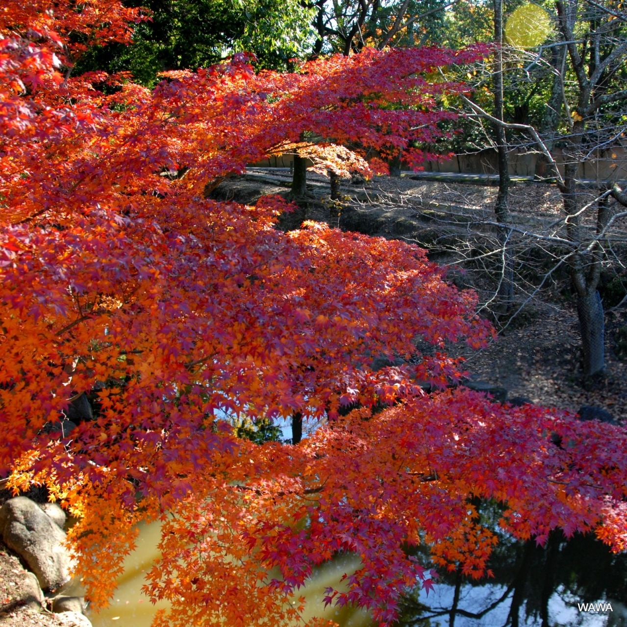 紅葉を照らした鷺池に浮かぶ美しい御堂