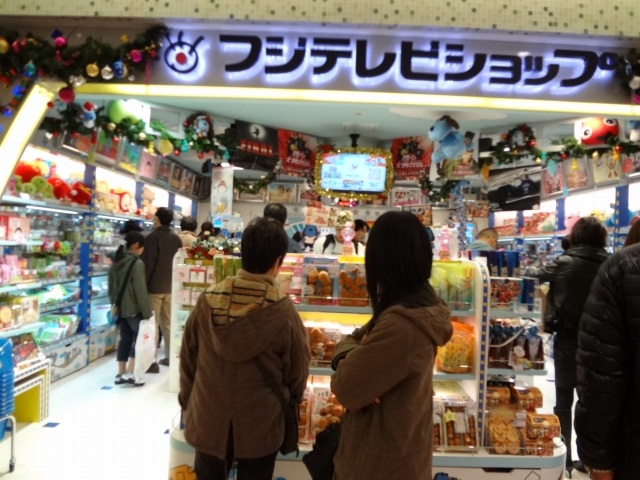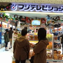 東京キャラクターストリートには各テレビ局やキャラクターの店があり、この店ではフジテレビに関連するグッズが売られています。サザエさんやワンピースのグッズがおすすめ。店内は大変混み合っています。