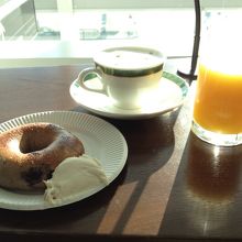 温めてクリームチーズをはさんだベーグルとコーヒーでゆったりした時間を過ごせます。施設自体も新しいので清潔感あります。