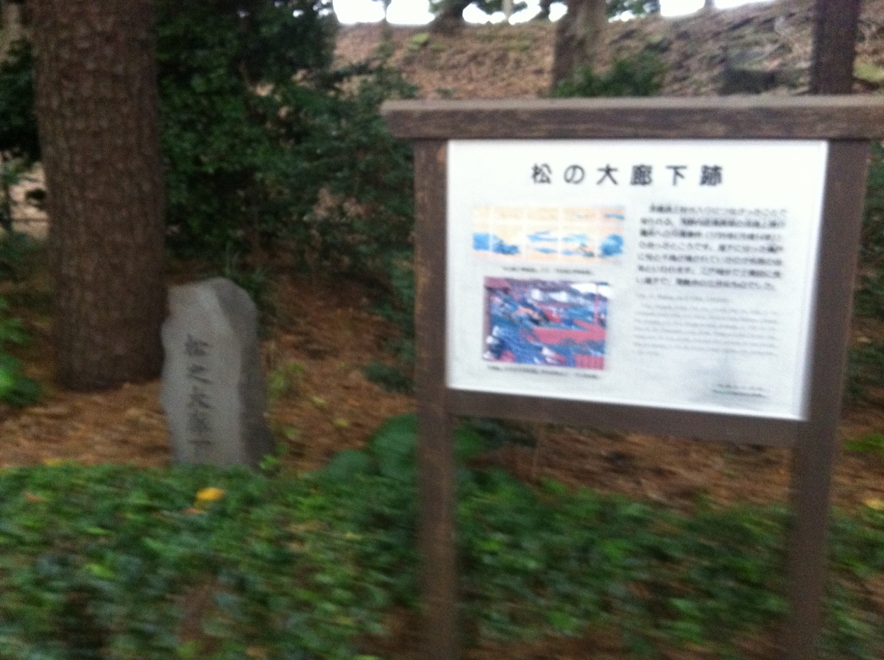 しかし、今では松の廊下を示す看板と、何もないと申し訳ないという感じで松が植わっているだけです。それ以外は過っての事件を思い出させるようなものは一切ないといっても過言でありません。