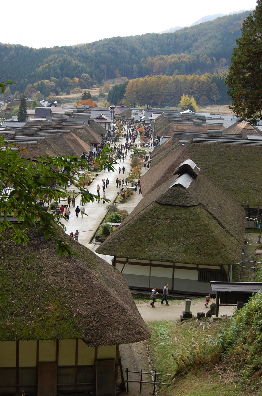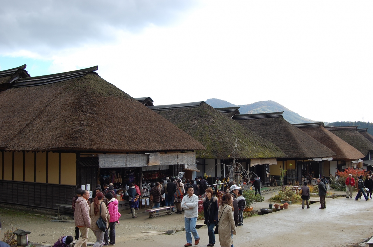 近年脚光を浴びている茅葺き屋根の街並みが趣き深い大内宿。休日のため当然観光客でいっぱい。街並みはほとんど土産物屋か名物長ネギを乗せたそばの店で普段の生活は垣間みられません。ちなみにそば屋は奥の方の店が空いているようです。