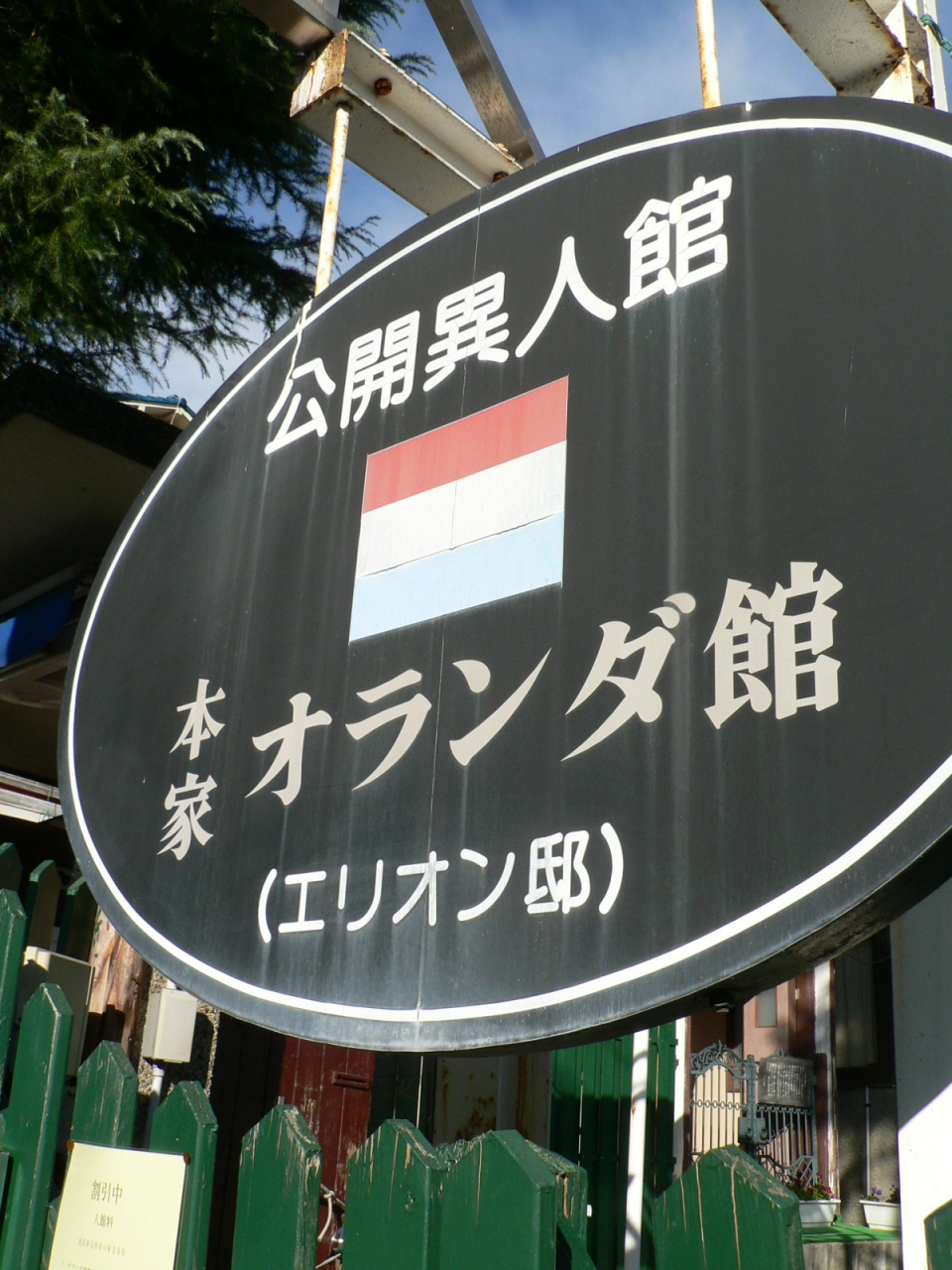 おらんだ坂の上り口に旧門があり、現在の入口は坂を中ほどまで上った所にある。オランダの貿易商チャーリー・エリオン氏の邸宅で1982年までは姉のメーベル・エリオンさんが住居として使用していたそうで前庭の花壇が美しい。館内では女性に限りオランダの民族衣装を無料試着できるサービスや各種ドレスのレンタル&撮影(有料)も楽しめるが2012.12月現在は閉館中。