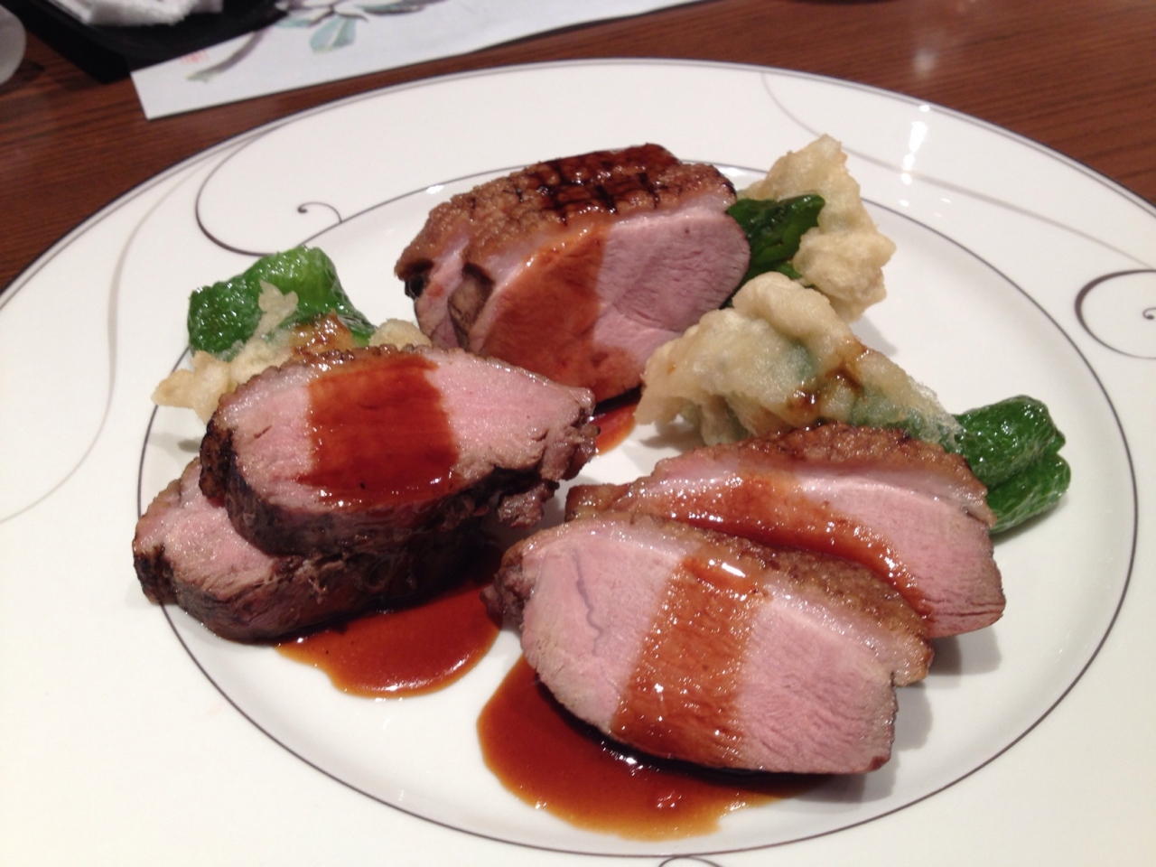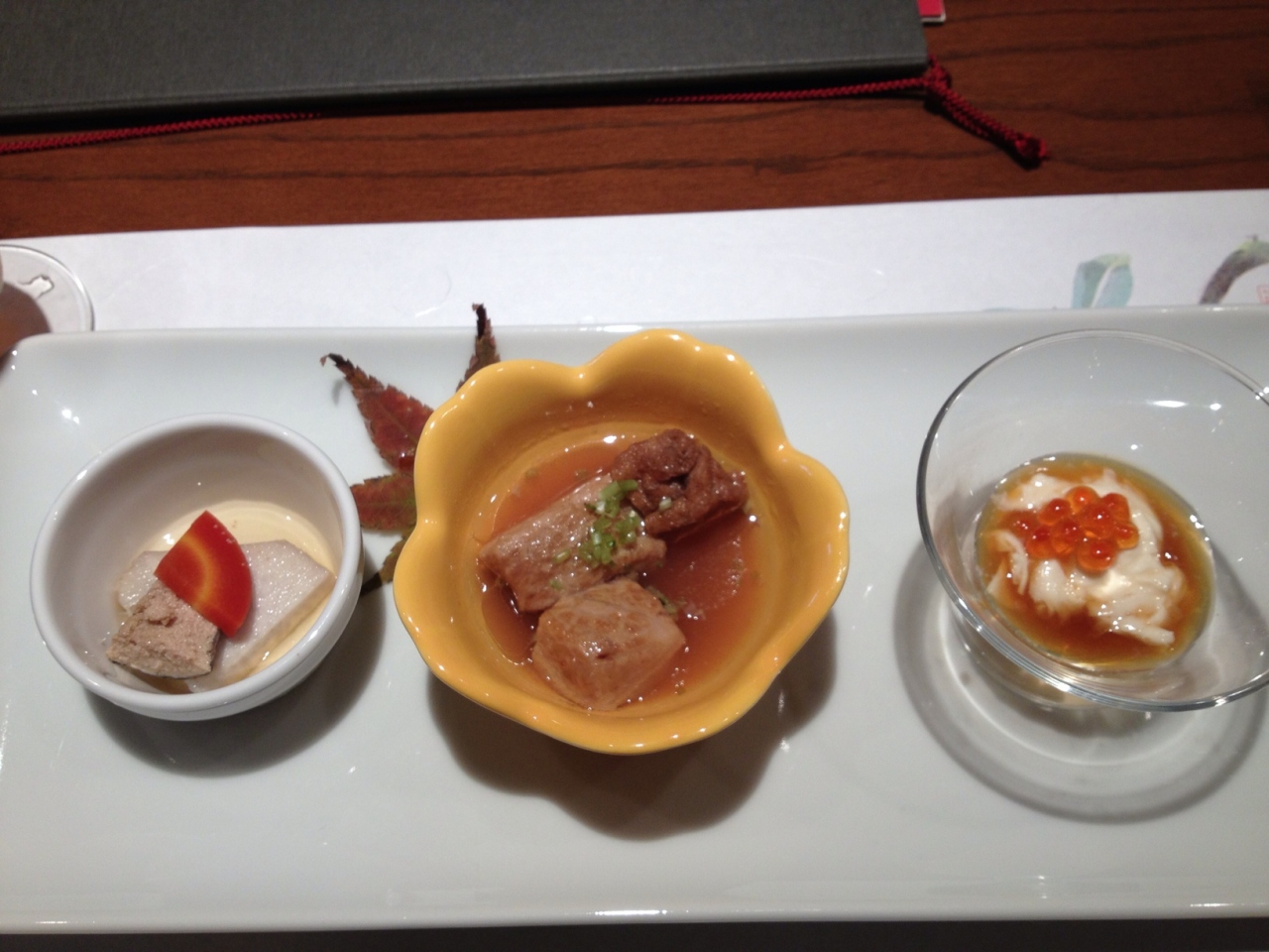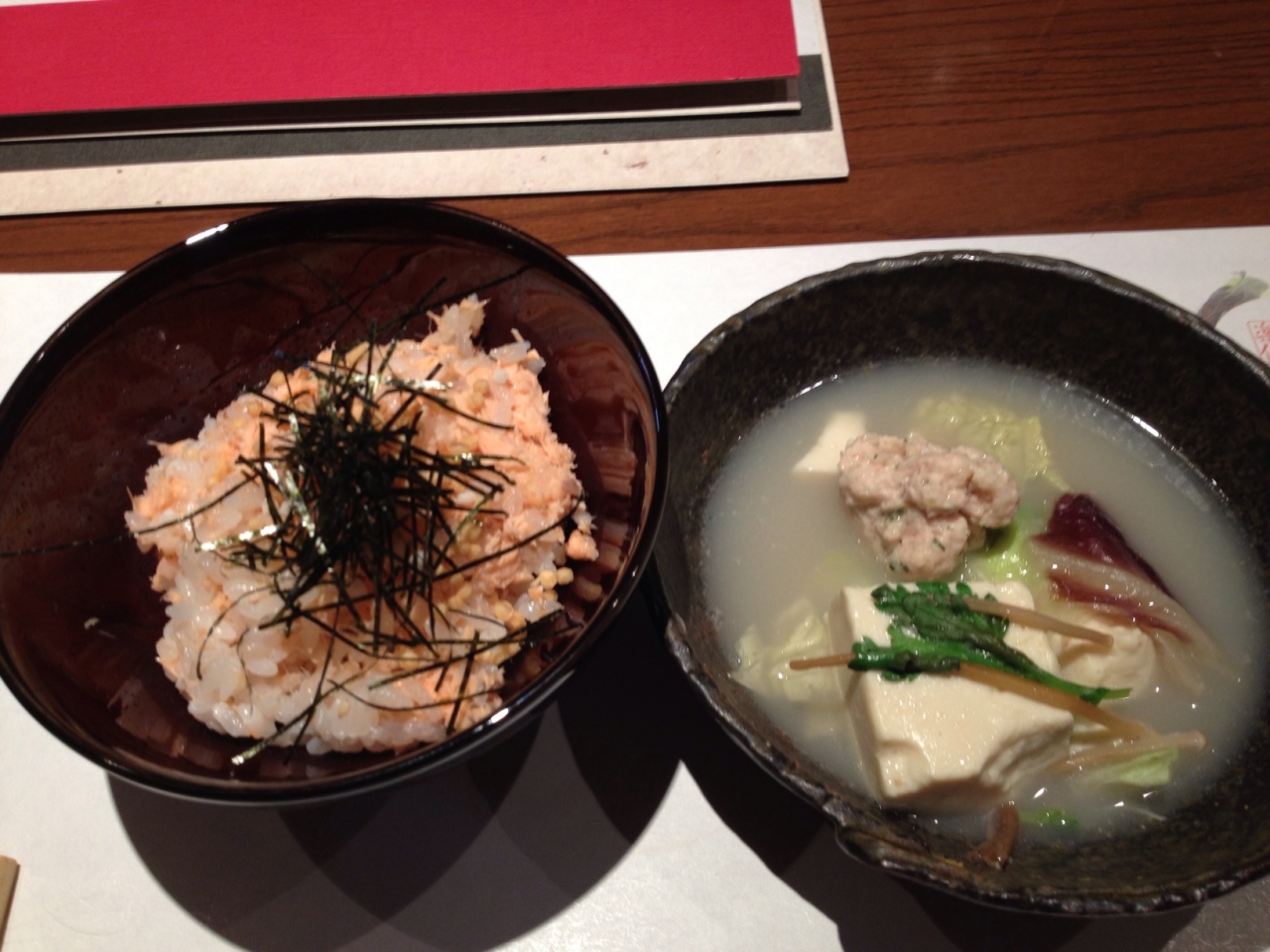 付き出し3種、お刺身、白身魚の昆布蒸し、鴨のロースト、サラダ、茶わん蒸し、鮭ご飯、デザートなどなどのメニューが次々と出てくるのですが、ごはんが出てくる前にすでにお腹がいっぱいになり始めたので、水炊き無くても良かったかなぁと思うくらいのボリュームでした。でも白濁したスープの水炊きは頼んで正解。コラーゲンたっぷりという感じがして美味しかったです。