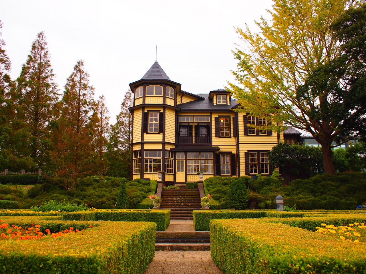 展望台側には、ヨーロッパの宮殿を思わせる四角いデザインの庭園があり、その正面に建つ外交官の家がたいへん絵になる光景でした。