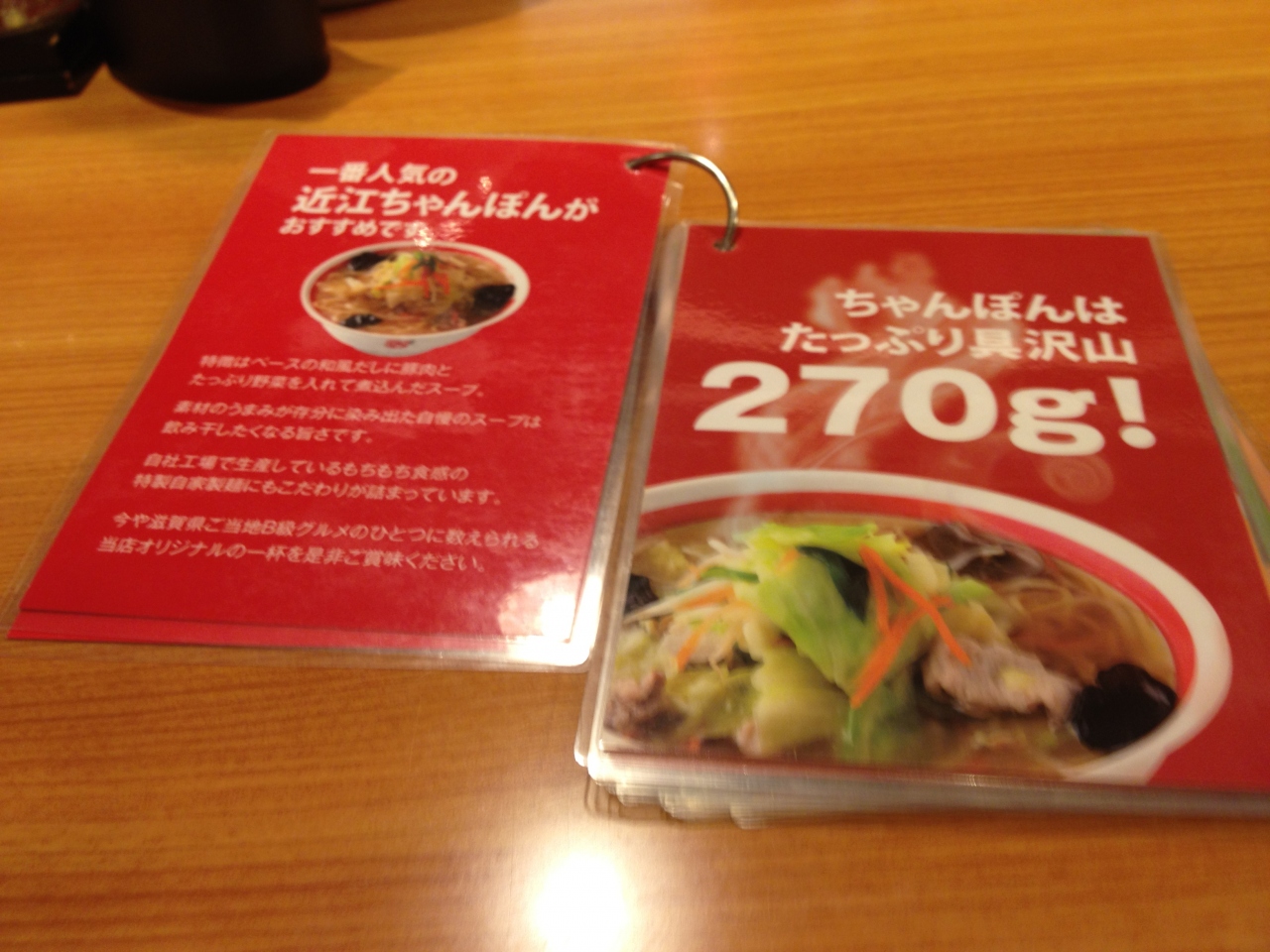 ちゃんぽん亭総本家 のメニューです。メニューは、セットメニューはもちろんの事、単品も有りますが、特に、このラーメンのおいしさ、ヘルシーさをアピールするためのカードです。このカードを1枚1枚よく見ると野菜が270グラム入っているとか黄金だしの秘密とか、、、書いています。ぜひ、一度、