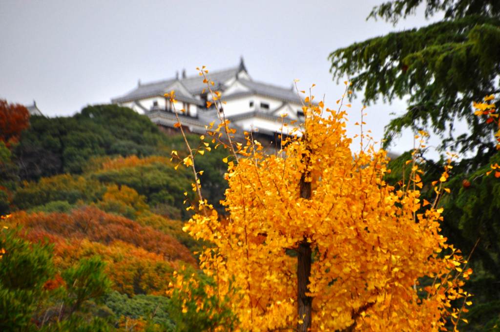 松山市内の中心にある勝山の上にそびえていて、市内中心部から仰ぎ見ることができる。四国最大の城だそうで、天守閣は、日本国内に12しかない現存天守閣。晩秋、美しさを増した黄葉を手前に見ながら眺め、城だけでなく対照物があると、さらに映えると思った。勝山に登る城山ロープウエーは補修のため2013年1月半ばから2か月ほど運休するそうだ。