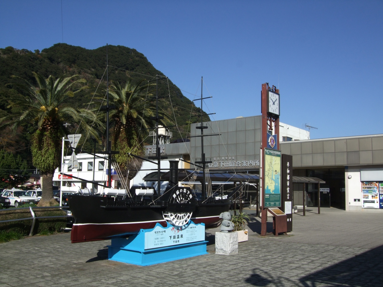 伊豆急下田駅は、伊東駅から始まる伊豆急行の終点です。東京地区から「南伊豆フリー切符」で行きましたが、伊豆急の区間の列車は、海側の窓を正面にした座席で、素晴らしい景色を堪能できました。なお、「南伊豆フリー切符」は、踊り子号が利用できて、11,400円。石廊崎や西伊豆の堂ヶ島、松崎までの東海バスの利用も含みますので、南伊豆・西伊豆の主要な観光地は全て回れますので、かなりのお得感です。駅を出ると写真の黒船。日米和親条約が締結された地の玄関口らしい雰囲気です。バスのターミナルもすぐで、下田観光バスの案内所もあります。