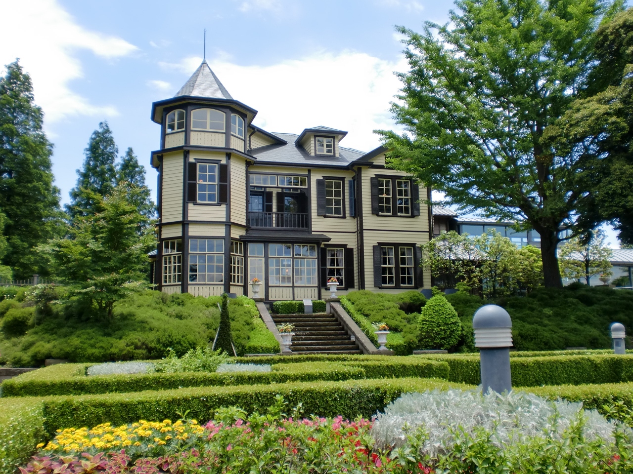 山手イタリア山庭園にある洋風建築です。まず目を見張ったのは建物の色使いです。クリーム色を基調にして、茶色と白がとても見事に調和しています。私が行ったのは新緑の季節でしたので、建物の前の庭木は鮮やかな緑色でした。そしてその前の花壇には綺麗な花が咲いており、建物・庭園の草木・種々の花々が織りなす景色は本当に見応えがありました。