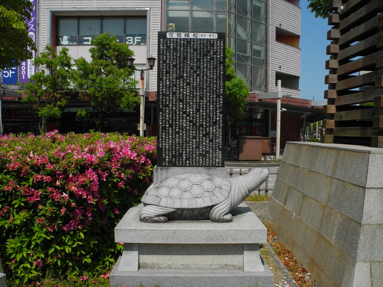 彦根駅 (ひこねえき)前には、石碑が立っています。この石碑は、彦根縁起を記しています。古く平安時代や飛鳥時代までさかのぼって記載されています。ぜひ、一度、そんな石碑を見に行ってみてください。縁起ものです。
