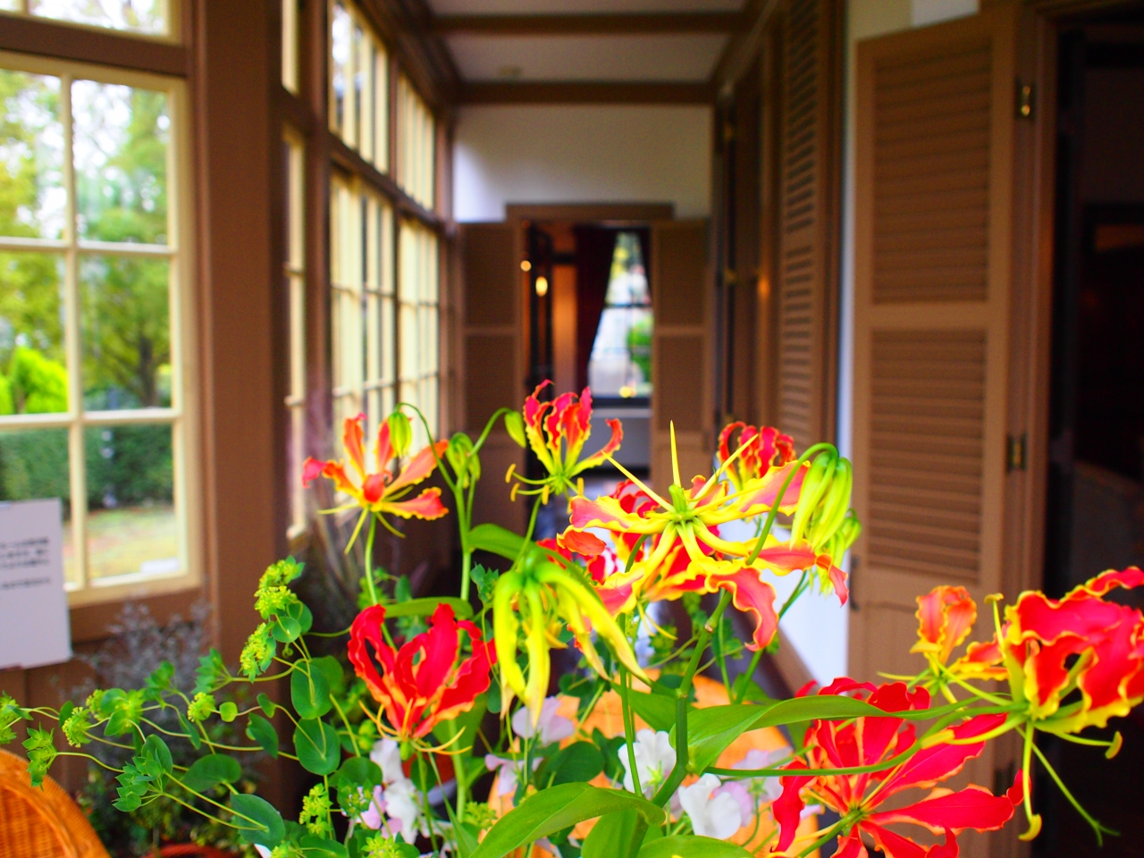 館内に活けられたフラワーアレンジがレトロな室内に彩りを与えており、たいへん見応えがありました。