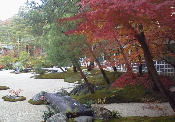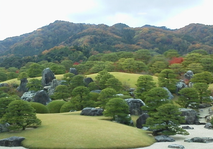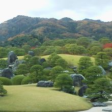 館内からは、整えられた庭園と自然の山々の景色の融合美が楽しめます。