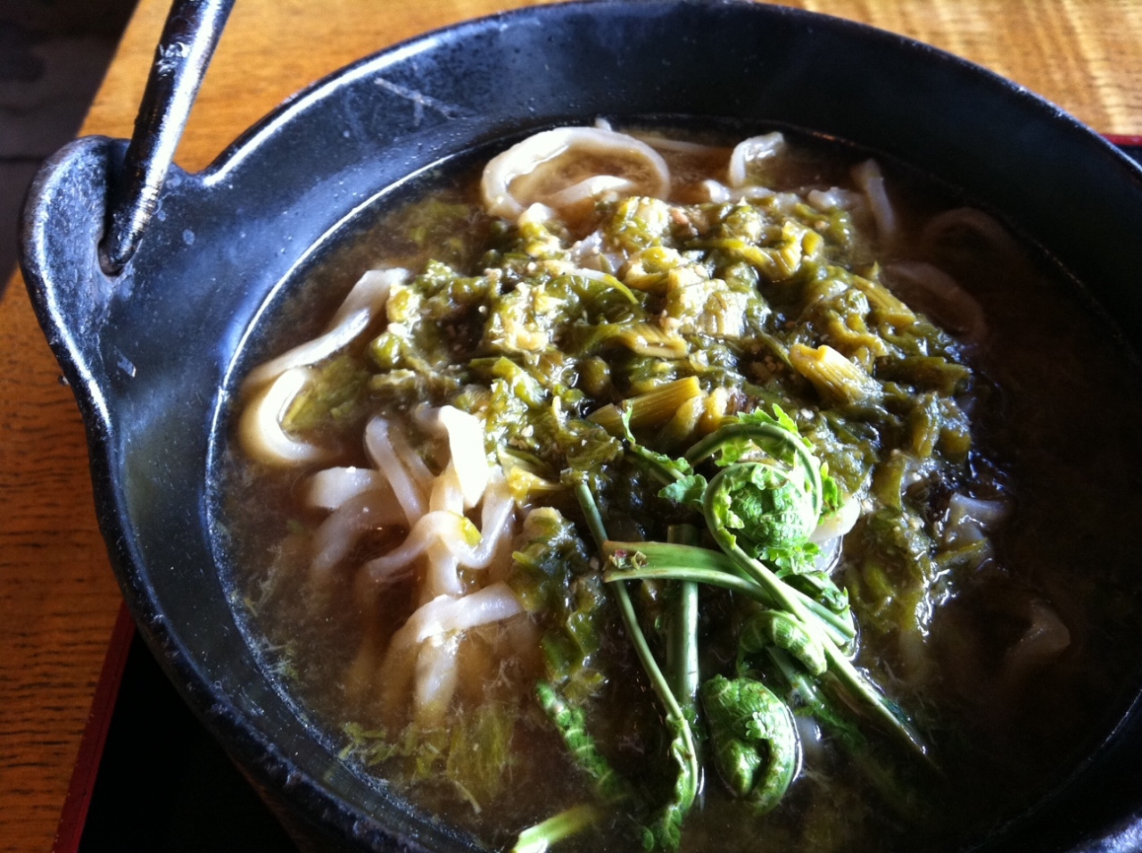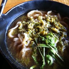 ふきのとうたっぷりの味噌仕立てのうどんが