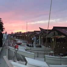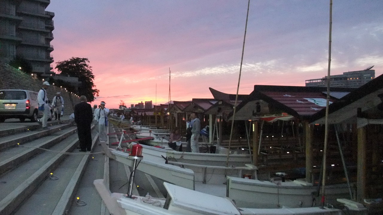 一八楼にチェックインし、すぐ近くの鵜飼船の待合所まで徒歩で向かいます。所要時間はわずか5分ほど。近くにはお土産屋さんがあり、堤防を歩いているだけでも気持ちいいスポットです。川には屋形船がずらりと並んでいます。ここだけでもアルバムの一ページになりそうな風景でした。