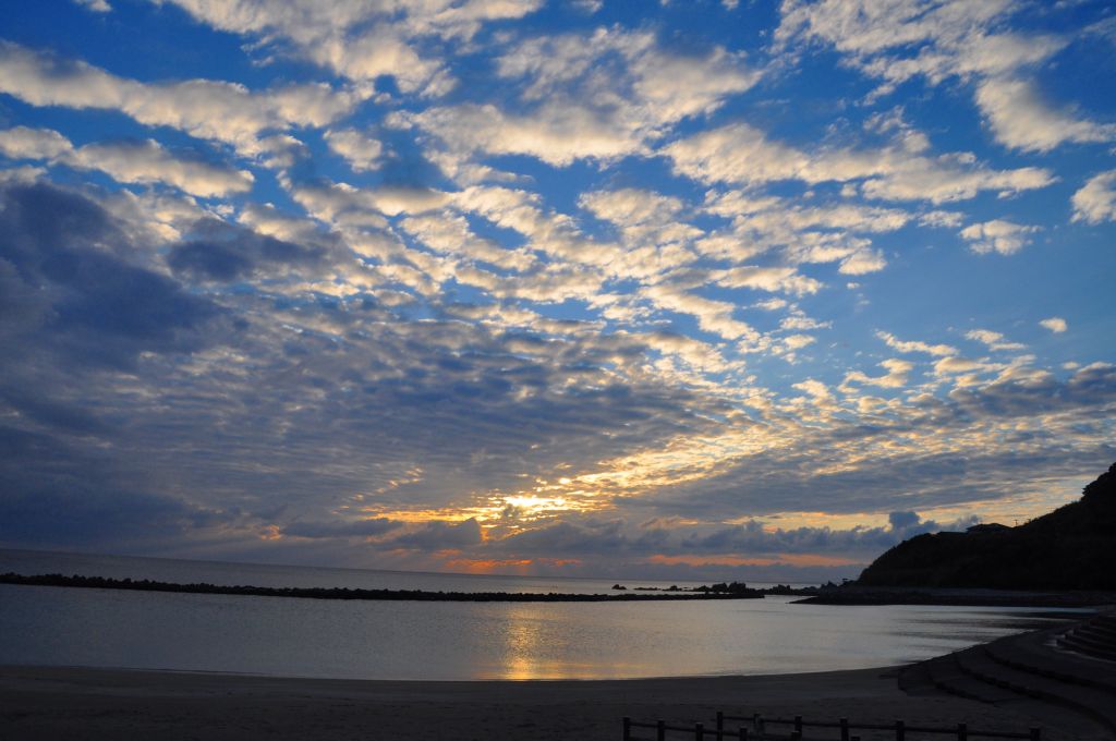 天草の公共交通、路線バス網の中心、本渡バスセンターから富岡港行きに乗って、終点近くのバス停「3丁目」で降りると、目の前が富岡海岸だ。天草灘に面していて、夏は海水浴場になるというが、訪ねたのは初冬。ちょうど、雨上がりの夕方だったが、水平線に広がるまだら模様の雲間に日没が見え、夕日と雲が美しかった。