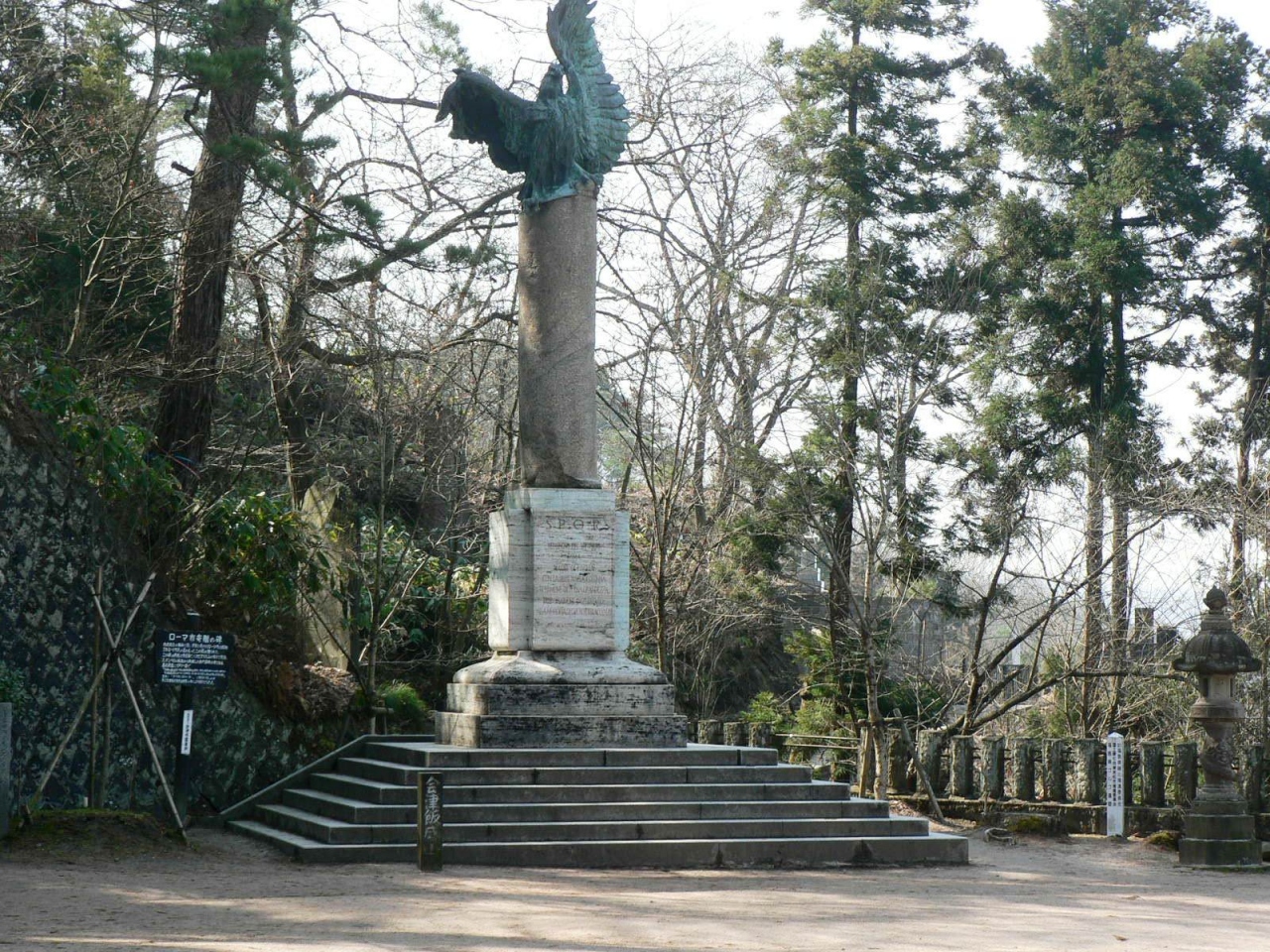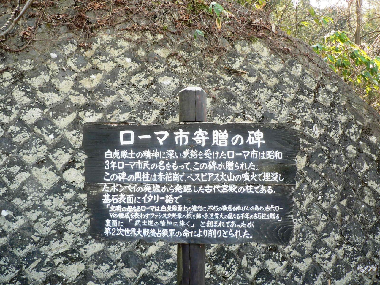 イタリアのローマ市は白虎隊の精神に深い感銘を受け昭和三年、ローマ市民の名をもって碑が贈られた。碑の円柱は、ベスビアス火山の噴火で埋没したポンペイの廃墟から発掘した古代宮殿の柱だそうだ。基石表面にイタリア語で「文明の母たるローマは、白虎隊勇士の遺烈に、不朽の敬意を捧げんがため古代ローマの権威を表すファシスタ党章の鉞(まさかり)を飾り、永遠偉大の証たる千年の古石柱を贈る」裏面に、「武士道の精神に捧ぐ」と刻まれてあったが、第二次世界大戦後、占領軍の命により削り取られている。
