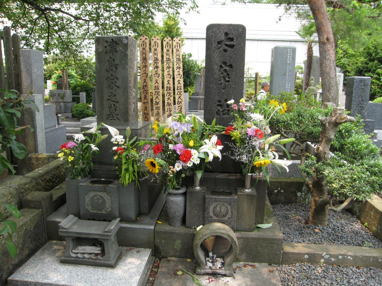 太宰治と三鷹そして桜桃忌。たくさんの花が供えられた墓に向かい手を合わせる人。6月19日がその日なのですが、6月14日に行きました。すでにたくさんの花が供えられておりました。三鷹駅から三鷹通りを1kmほど南下すると八幡大神社が見え、次の門を回り込むと太宰治の墓がある禅林寺です。