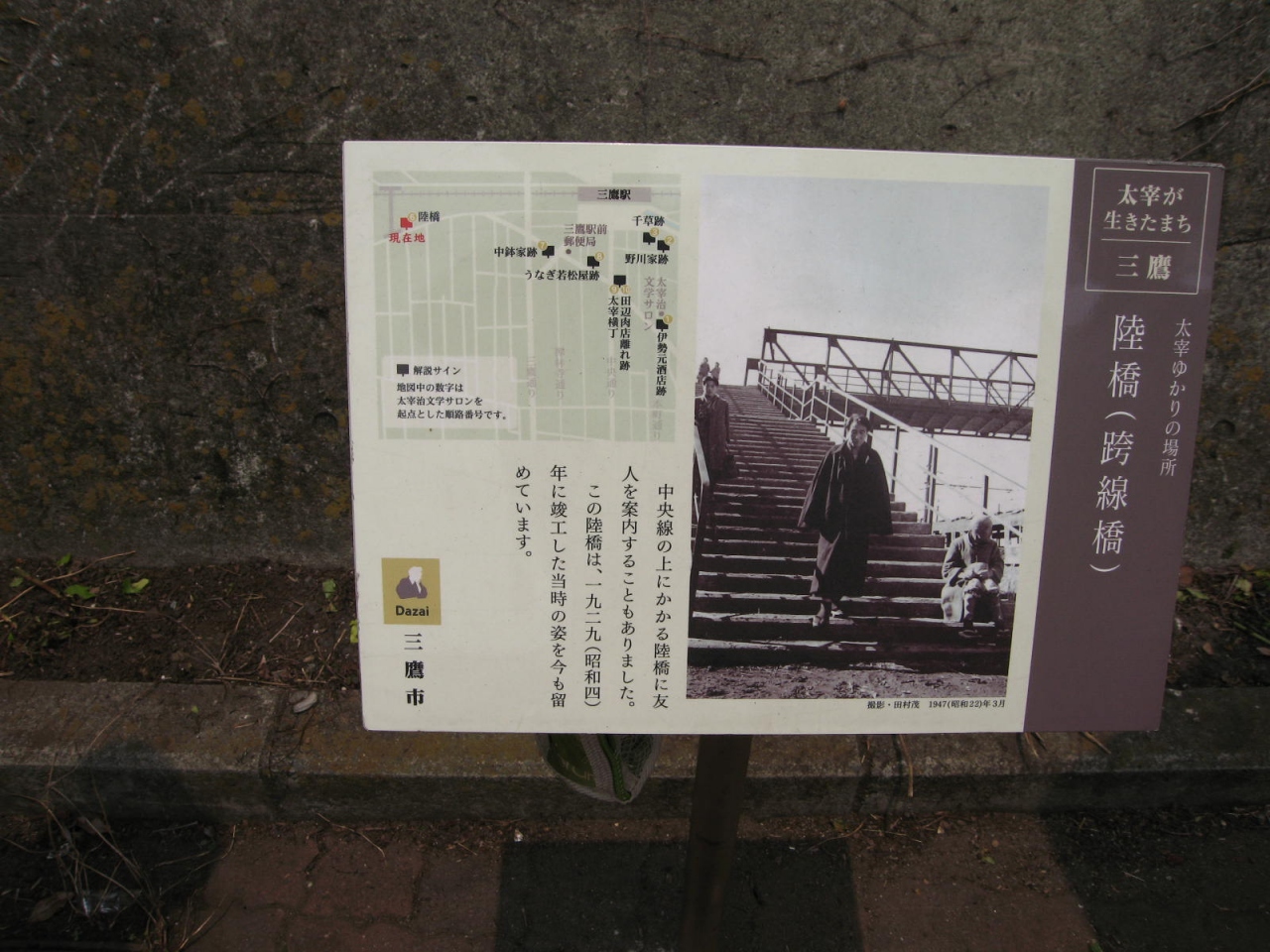 中央本線三鷹駅です。橋上駅舎になっていて珍しいと思いました。著名な駅なのですが、ここが拠点になっていないとなかなか下りてみることは少ないのだということが分かりました。このときは太宰治の縁を訪ねて行きました。太宰が訪問客をよく連れて行ったという陸橋(跨線橋)にも行ってきました。