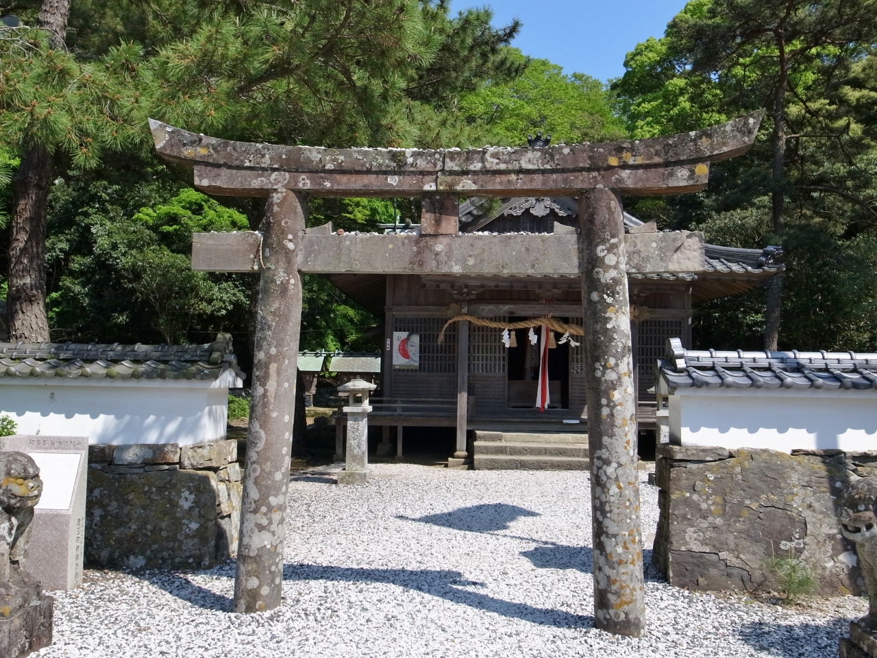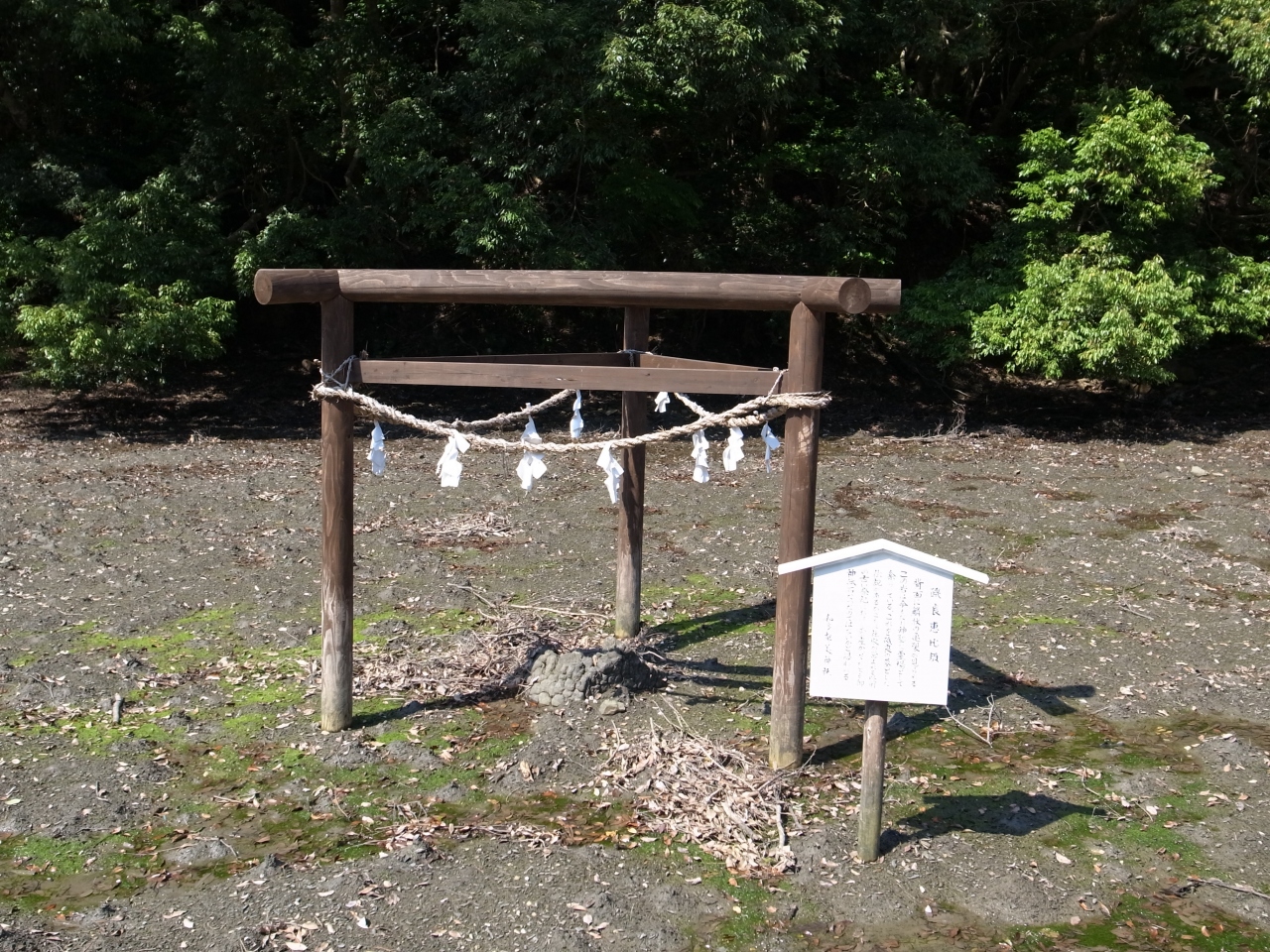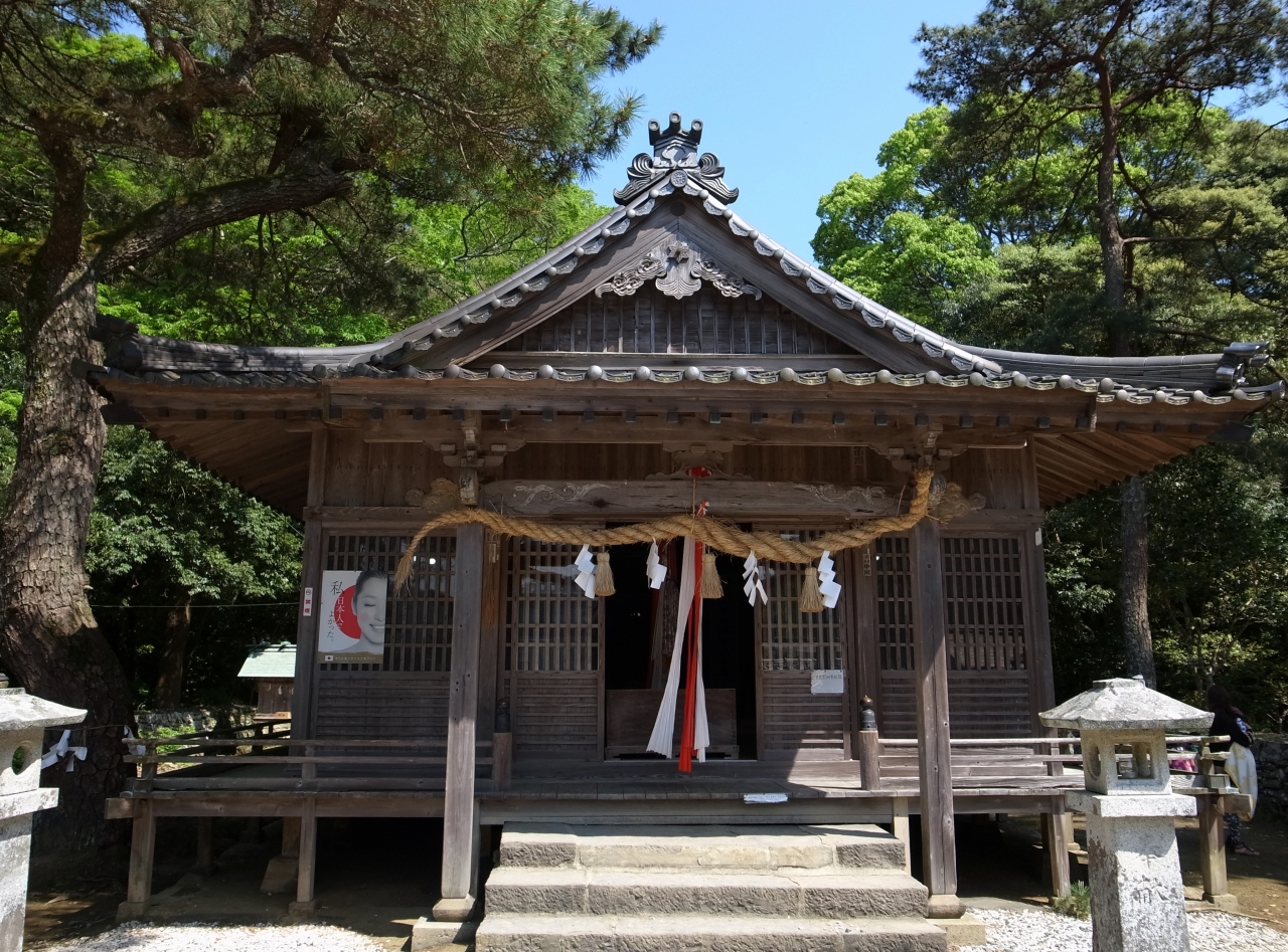 海神豊玉彦命とその娘豊玉姫、その夫彦火火出見尊(ひこほほでみのみこと。日向神話の山幸彦)をお祀りしています。この辺りに海神の宮があったとも言われ、神功皇后の新羅討伐の時道案内をした海人族の祖、阿曇磯良(あずみのいそら)の墓もあります。満潮になると境内近くに海水が来て、海の中に鳥居が立つ、厳島のような趣の神社ですが遙かに古風で素朴でした。