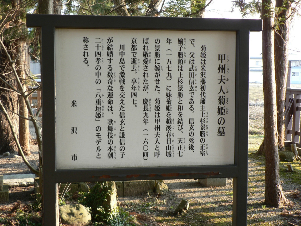 菊姫(きくひめ、1563年−1604年)は、武田信玄の六女で甲越同盟(1579年)の証として上杉景勝に嫁いだ。上杉家中から甲州夫人と呼ばれ、質素倹約を奨励した才色兼備の賢夫人として敬愛された。墓所は京都妙心寺亀仙庵(現隣華院)で後年米沢林泉寺にも墓碑が建立されている。