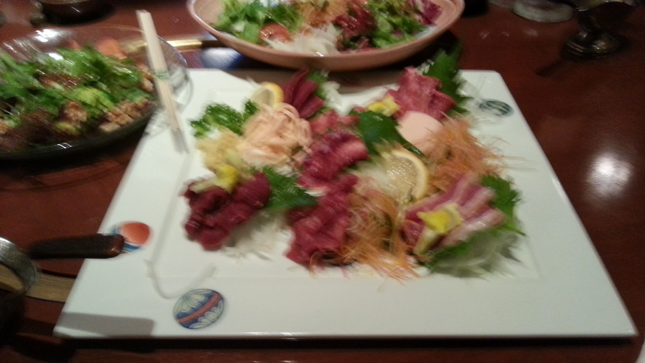 料理は刺身、焼き物、しゃぶしゃぶなどでコースもありましたが、単品でオーダーしていきました。刺身といえば魚貝の刺身ばかりで肉の刺身、それも馬肉の刺身などは過去に一度しか食べておらず、それからだいぶん時が経過しているのでどうかなあと思っていましたが、すごく味があるというか、しつこくもなくおいしかったです。8品ほどの盛り合わせを注文し、やはり特選とよばれるものがすごくおいしかったのですが、そのほかの部位も魚貝などにはない感覚や味わいがあって良かったです。しゃぶしゃぶは初めてで私としての感覚は、牛と豚の中間みたいな感じで牛みたいなしつこさはなく、するするとおなかに入っていくといったような感じでした。この2種類の料理が特に印象に残りましたね。