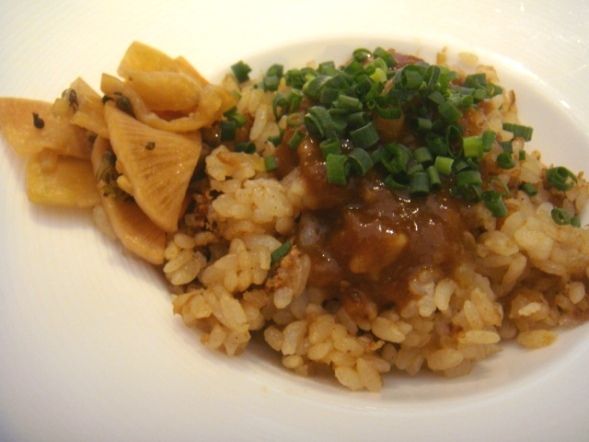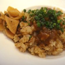 ガーリックライスを作るように、カレーとご飯を炒めます。