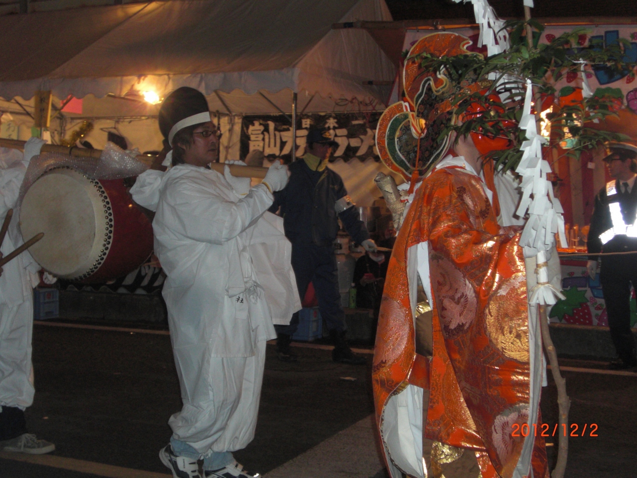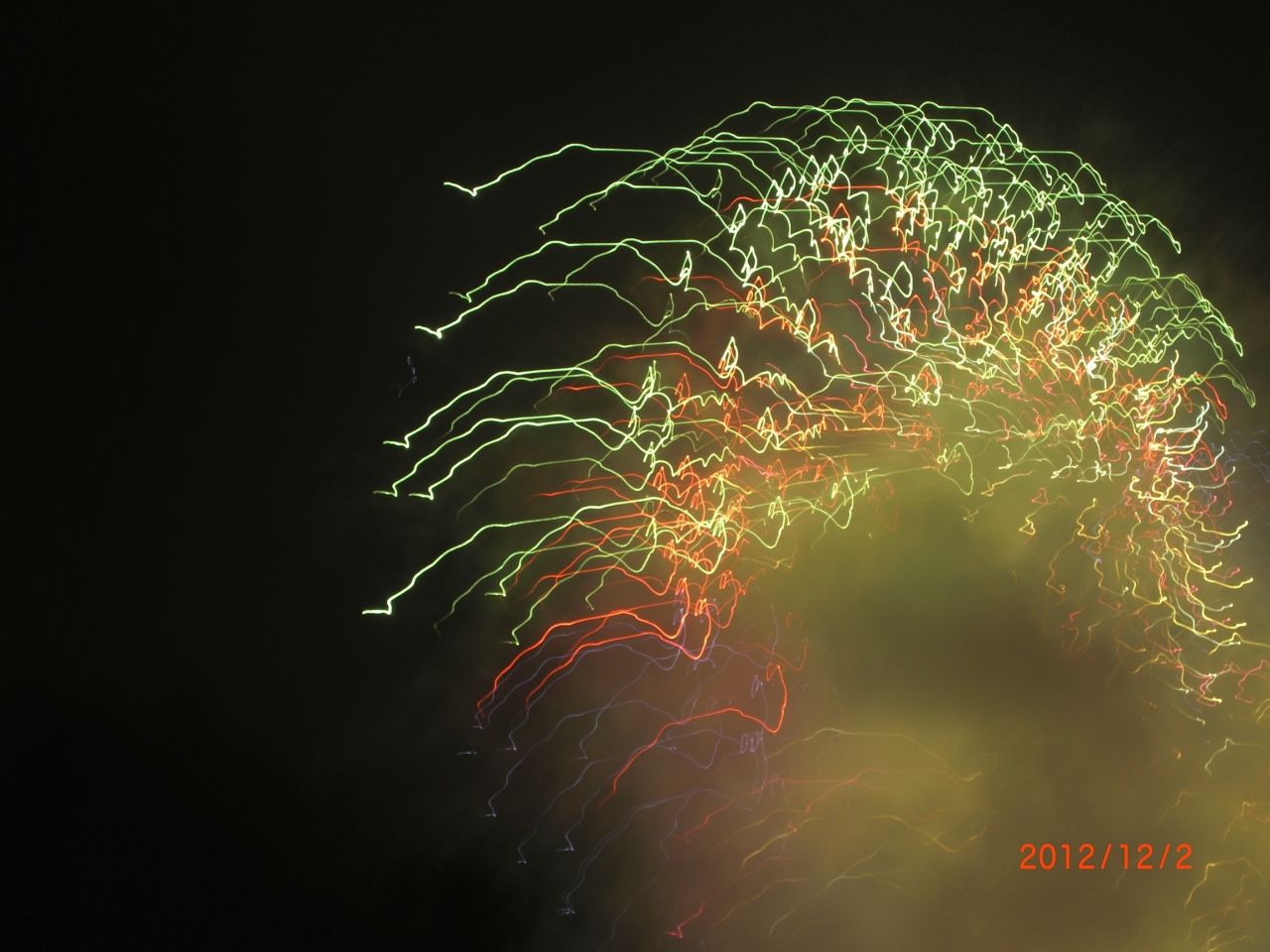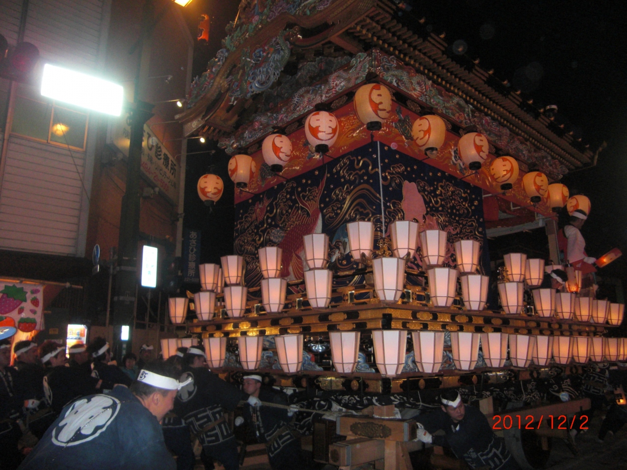 念願がかなって夜祭に行くことが出来ました。寒い寒いと聞いていたので、厚着をしていきました。昼間が曇っていたので、寒さはあまり感じませんでした。屋台を待っている間に、地元の人たちに話を聞くことが出来、屋台の上には建築関係の人しか上がれないのでそのためにその仕事に就く人もいるらしいです。屋台の方向転換は見ものです。羊山公園からの花火は風が無く煙の中に入ってしまい残念でした