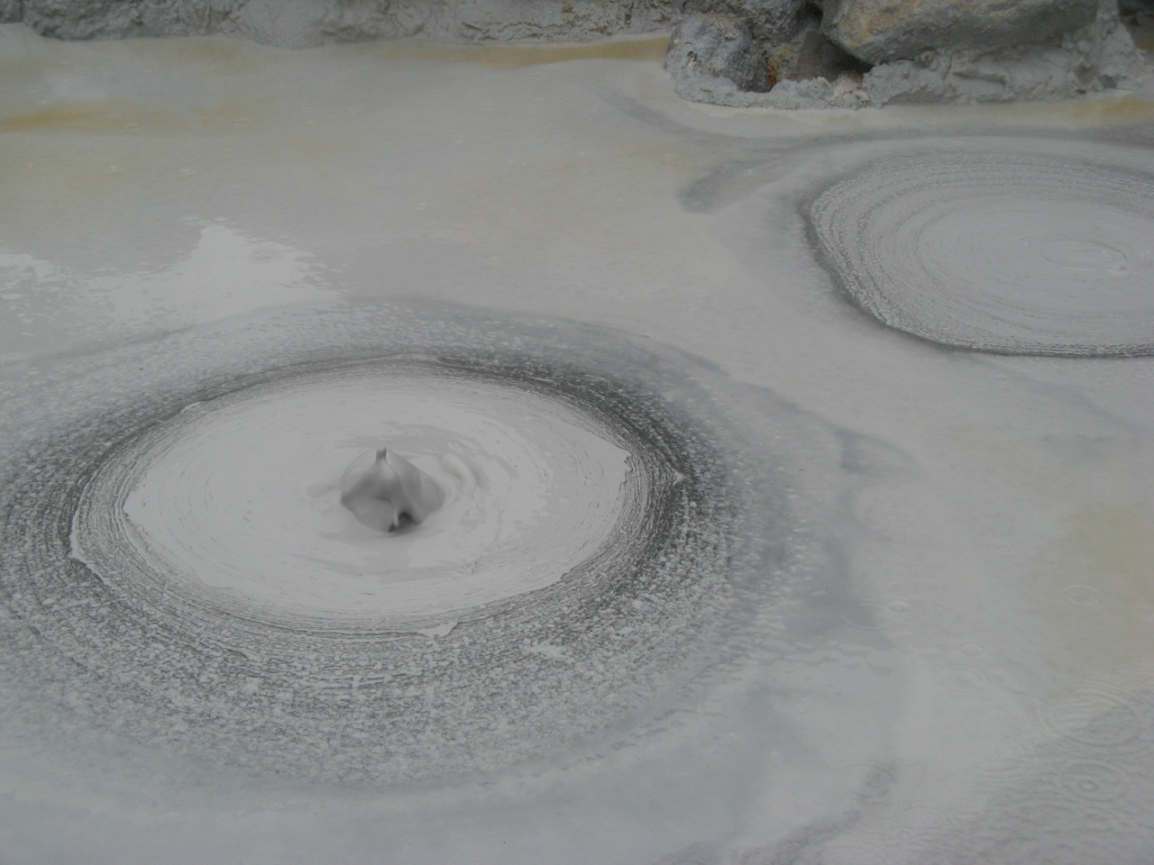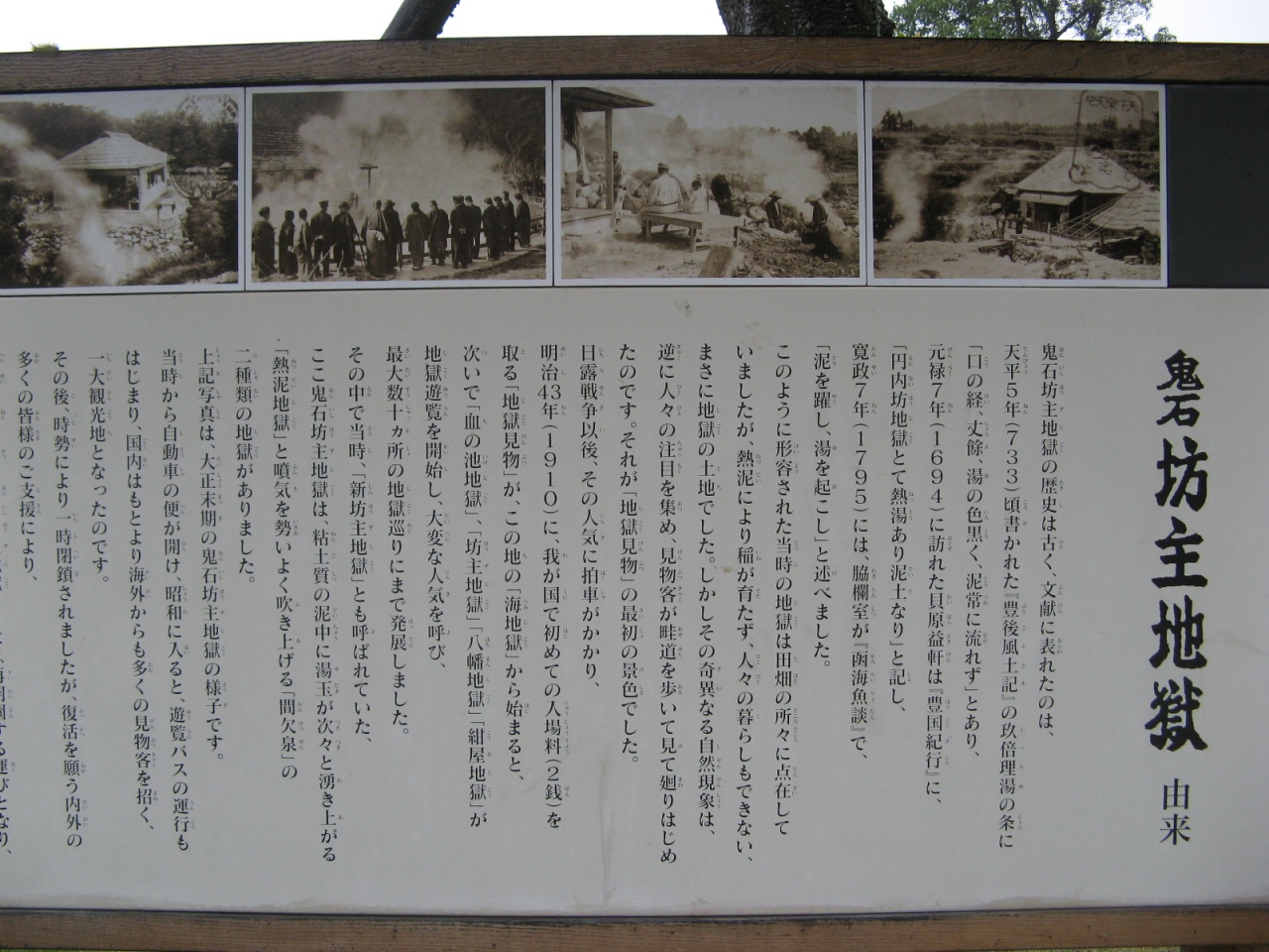 「鬼石坊主地獄」は別府温泉地獄めぐりの中でも、一番高台にあり見晴らしもよく、広くは無いですが綺麗に管理されていました。見るからに粘度の高そうな灰色の泥湯がボコボコと湧き出す様は見ていてあきませんでした。湧き出す泥湯が坊主頭に似ているので、“坊主地獄”という様で、その直径は様々ですが、大きいものになると50?を越すようなものがありました。