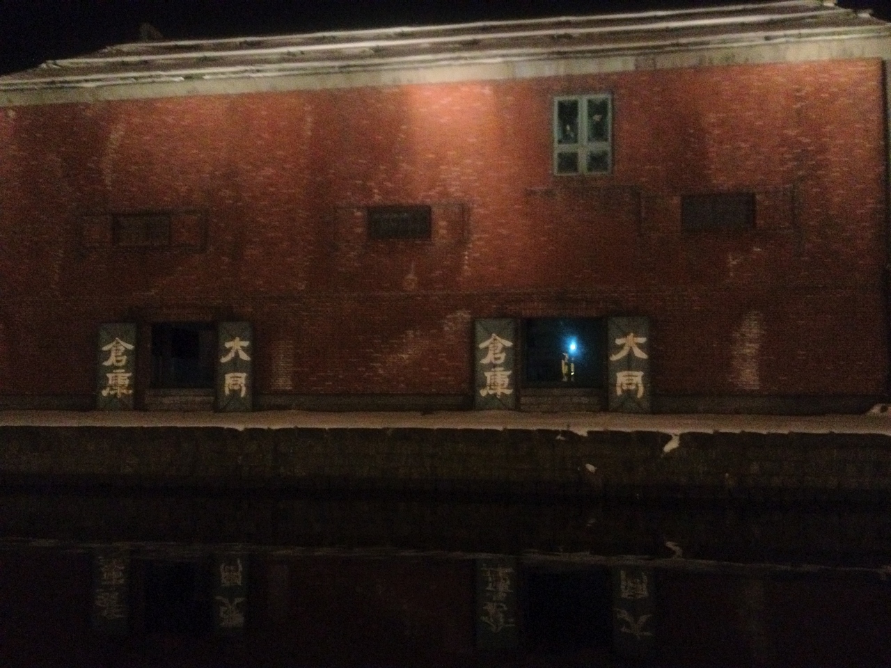 小樽運河の海側に立つ煉瓦の壁が、運河の水に映り、「大同倉庫」の文字が時代を感じさせます。