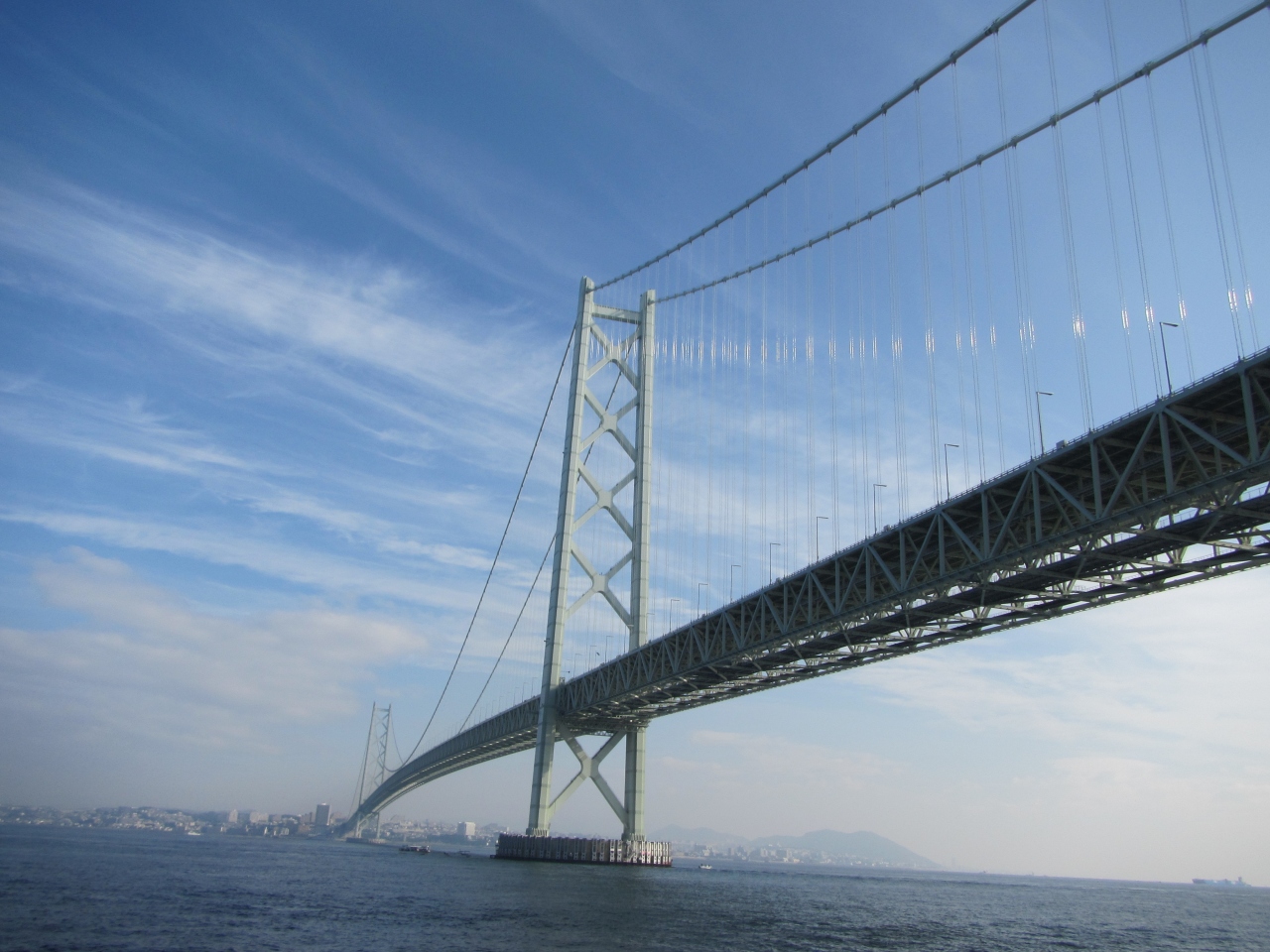 明石海峡大橋は、船でくぐった景色が最高です。手軽にくぐるには、明石港と淡路島の岩屋港をむすぶ、高速船ジェノバラインがあります。くぐる位置は、淡路島側の主塔と淡路島の間です。晴れた日には、最高のアングルの写真が撮れるでしょう。