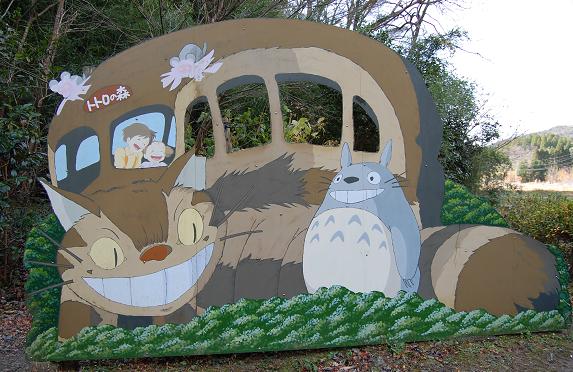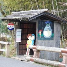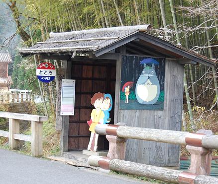 ひっそりとした山間にたたずむ「ととろ」と書かれた大分バスのバス停。1日3本、佐伯から路線バスがやってきます。バス停の中には、誰が作ったのか、トトロの主人公のパネルがありました。バス停の周辺は道幅が広くなっていますが、その前後はすれ違いが困難な狭い道でした。