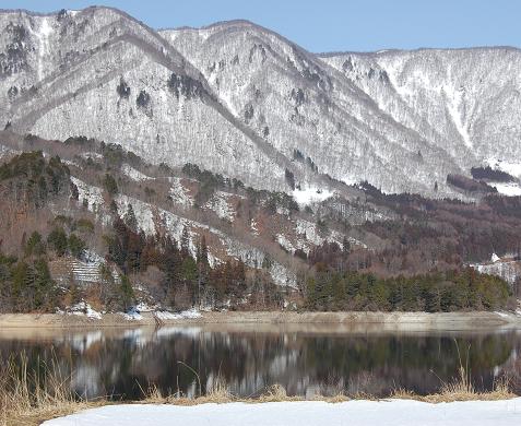 JR大糸線沿いにはいくつか湖がありますが、この青木湖は臨時駅のヤナバスキー場前駅の線路の向こうに広がる透明度の高い湖です。夏場にはカヌーなどで賑わうこの湖も、その他の季節はひっそりとしており、鏡のような湖面に対岸の山なみが映っていました。