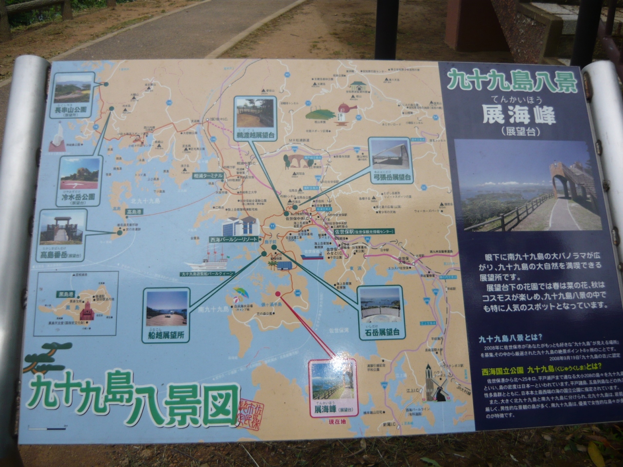 女子五人で平戸・熊本観光ツアーに行ったときに「展海峰」を訪れました。佐世保市街から南の方に車でおよそ30分、俵ヶ浦半島のほぼ中央に「展海峰」があります。展望台からは眼下に展開する南九十九島や向いの船越地区、佐世保市街地などすばらしい景色を望むことが出来ました。車がなければ行けないところですが、大きな無料駐車場やみやげ物店などもあるので、天気の良い日のドライブをお奨めします。