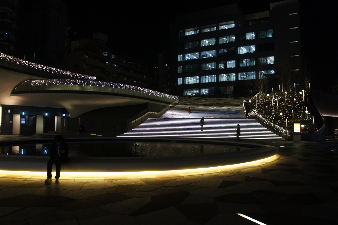 新宿イーストサイドスクエアの池を囲む中庭のような空間を飾ったイルミネーション。池に降りてくる広い石段のイルミネーションは、上を歩くと階段の光が点いたり消えたりしているような錯覚が起きるようで、目がパチパチして、奇妙な感覚。上から全体を眺めることもできますが、この不思議な感覚を楽しむのはここならではだと思いました。