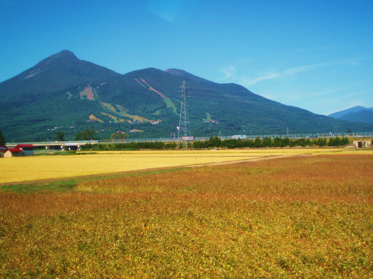 蕎麦の花と磐梯山 秋には黄金色の稲が美しい