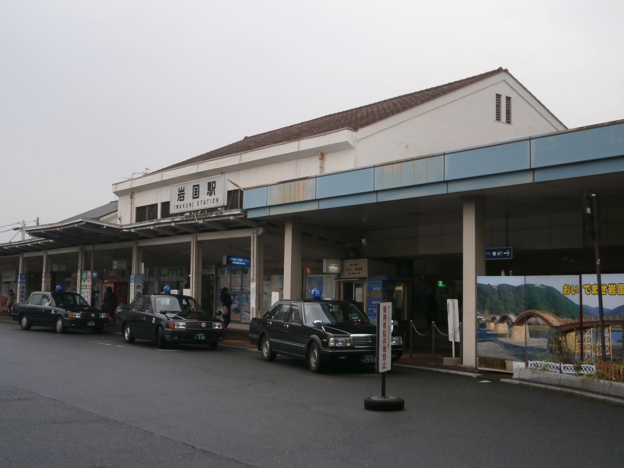 駅舎内には、ハートインのコンビニやキオスクなどがあり、駅前(左)からは錦帯橋方面行のバスが煩雑に出ています。