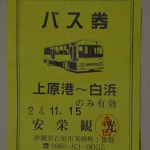 石垣港の「石垣港離島ターミナル」の安栄観光(八重山観光フェリーと共通利用可)の切符売り場で購入すると上原港から白浜間の無料バス券(当日のみ有効)が頂ける。