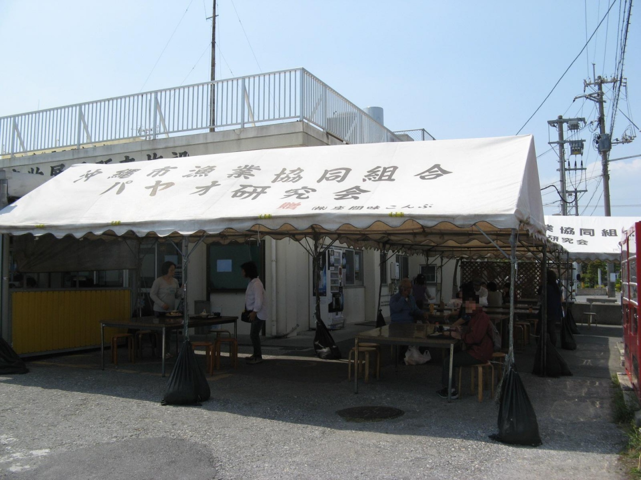 勝連城跡、海中ロードを観光した帰りに「パヤオ直売店」さんに寄せてもらいました。場所は沖縄市の泡瀬漁港の敷地内にあります。沖縄には北谷や名護、都屋など漁港の敷地の中に漁業関係者が経営する“食堂”が多くあります。ここは海産物や果物を売る市場と食堂が一体になったようなところです。したがって、食堂は綺麗なお店という訳ではなく、洗練された料理を出すわけでもなく、安く気軽に新鮮な魚や市場で買ったテンプラなどが食べられるという所です。この日は、私が“寿司定食1300円”、家内が“海鮮丼1300円”を注文しました。今回食べた場所は、市場の外にしつらえられたテントの下の席です。“寿司定食”には8カンの握りずし、“海鮮丼”には8種類の魚が一切れづつのっており、どちらにも、魚のテンプラ2個と魚のあら汁と小鉢がついていました。テンプラは沖縄風のコロモの厚いテンプラで、揚げたて、アチコーコーで美味しく頂きました。勿論、お寿司もあら汁も大満足でした。