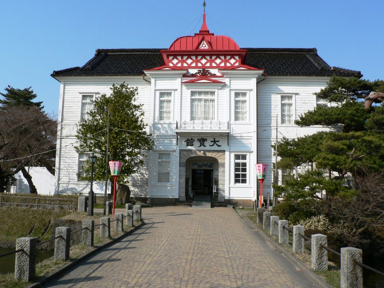 「大宝館」は、大正天皇の即位を記念して建てられた赤い屋根の白い洋館で、致道博物館にある旧西田川郡役所と共に美しい景観の建物。大宝館には鶴岡出身の高山樗牛(たかやま ちょぎゅう1871−1902年)、藤沢周平(ふじさわ しゅうへい1927−1997年)、妻の故郷が鶴岡でよく訪れていた横光利一(よこみつ りいち1898−1947年)などの資料が展示されている。