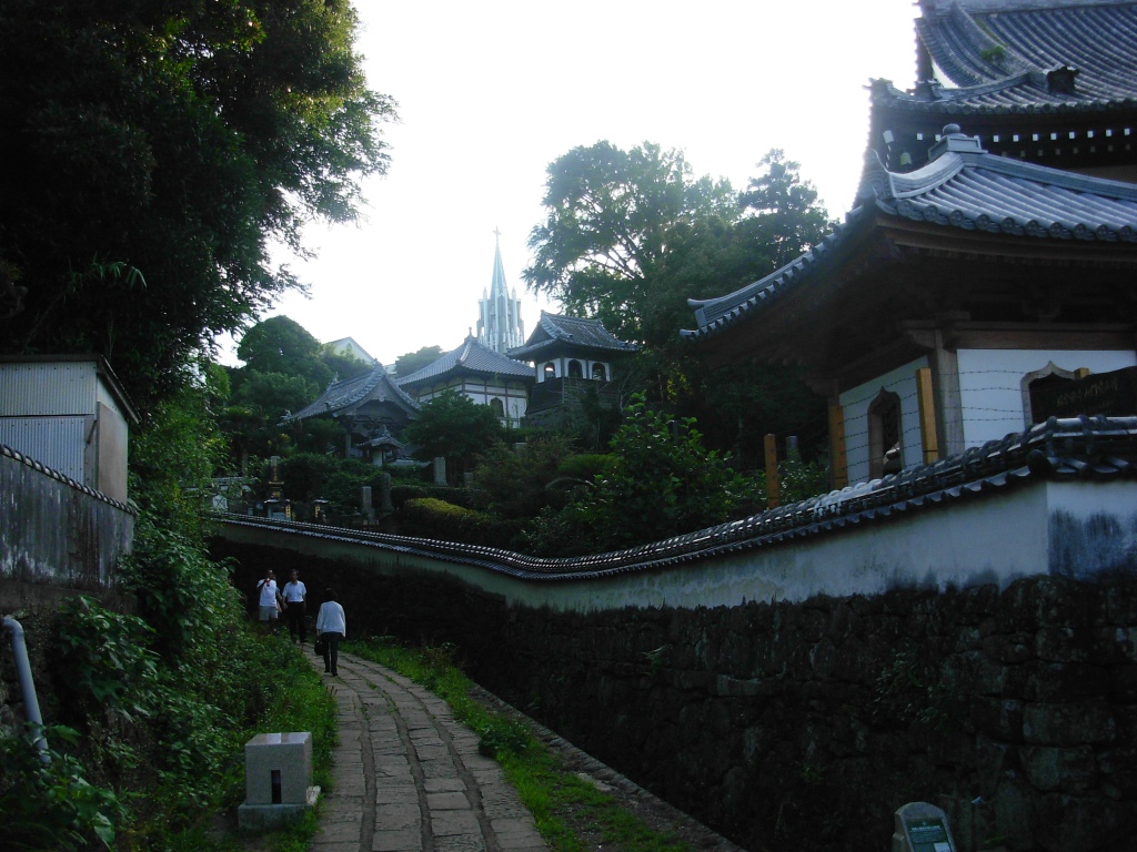 平戸市を代表する観光スポットとして紹介されていた「寺院と教会が見える風景」を歩きました。小高い丘の上にある聖フランシスコ・サビエル記念教会から坂道少し下り、ふと振り返るとお寺の向こうにサビエル教会の尖塔が見えました。フランシスコ・サビエル布教の地である平戸らしい独特の風景です。もっともお寺も唐風というか、あまりほかの地域は見ないような独特な造りで、全体的に面白い光景でしたけどね。