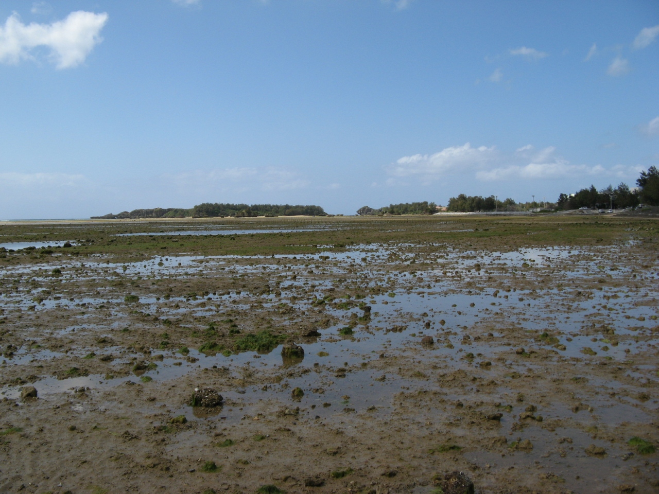 残波岬・やちむんの里へ遊びに行く途中に、「兼久海浜公園」に寄りました。場所は、嘉手納町兼久にある複合商業施設であるネーブルカデナ裏にあります。公園内には総合運動場やテニスコート、子供の遊具など、いろいろな施設が整備されていました。この付近は遠浅で、綺麗な海が広がっています。訪ねた時は引き潮だったので、遠くまで潮が引いた海を公園の堤防から日向ボッコをしながら眺めたり、磯遊びをしたり、のんびり、ホッコリした時間を過ごしました。公園には大きな無料駐車場もあるので、天気の良い日にはドライブの休憩にもってこいの公園と思います。