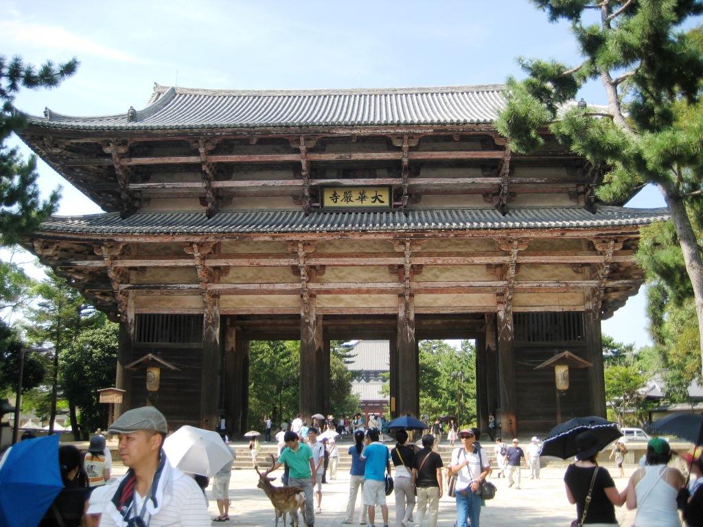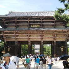 東大寺に向かう参道にそびえる大きな旧い門です。鎌倉時代に再建された国宝で門の中には有名な木造金剛力士像が向かい合っています。左が口を開いた「阿(あ)形像」で右が口を閉じた「吽(うん)形像」、合わせて「阿吽(あうん)」です。その形相はものすごい迫力があります。でも、参道の観光客目当ての鹿がたくさんいるので石畳は糞だらけです。