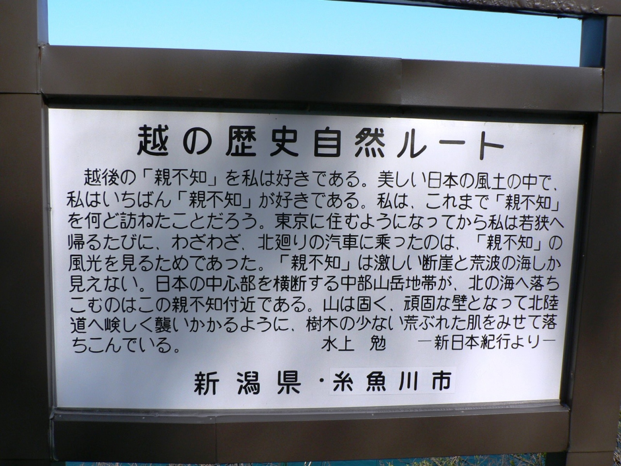 小説家、水上 勉(みずかみ つとむ、みなかみ つとむ、1919−2004年)は、福井県大飯郡本郷村(現:おおい町)生まれで日本海沿岸に住む人たちの生活の厳しさを良く知る人だ。水上 勉の越後つついし親不知、はなれ瞽女おりんなどの作品に親不知が描かれており、展望所には水上 勉の文学碑や親不知が登場する文学の紹介板がある。