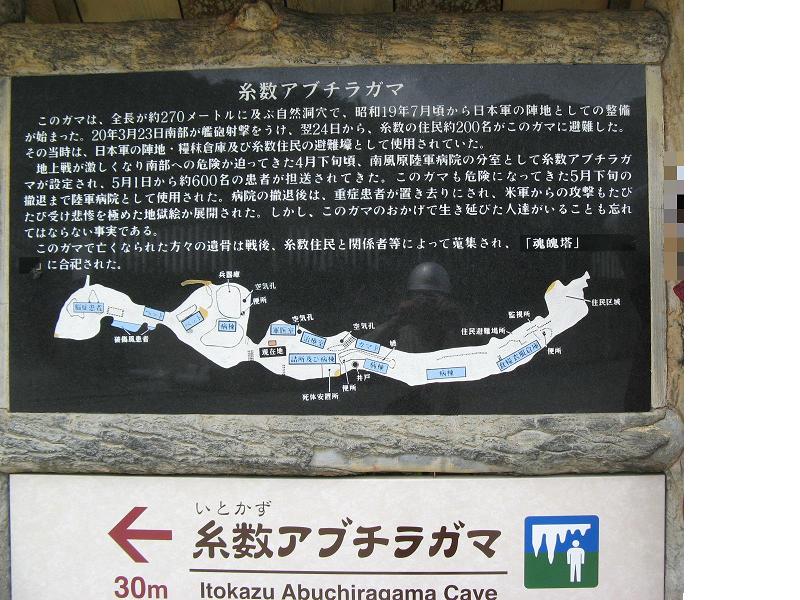豪に入ると、本当に暗闇です。懐中電灯(案内所でレンタル可)がないと真っ暗で何も見えません。一時は600名を超える負傷兵がひしめいていたという洞窟にある“病棟”とか“ベッド”、“治療室”、“脳傷患者”、“カマド”、“住民地区”等の標識を見ていると、その当時の兵隊さんや地区の住民の方々のご苦労が偲ばれ、胸が詰まります。こんな洞窟に無慈悲に非人道的な攻撃を加えた、米軍の所業は絶対に許せません。