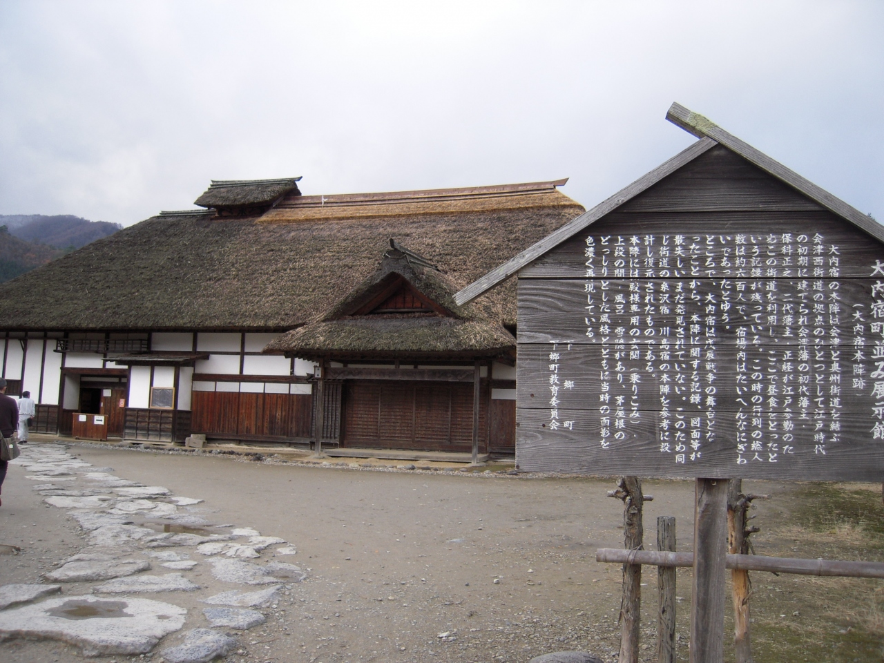 会津鉄道湯野上温泉駅から車で15分程度の山間にある大内宿はかつての会津西街道の宿場町です。大内宿の中に有る「大内宿町並み展示館」は、大内宿本陣を復元したもので大内宿の歴史や貴重な武具や生活用具が展示されてます。殿様が篭のまま出入りする乗り込み玄関、休憩室や寝室に利用された上段の間、ヒノキ風呂などもあり茅葺き屋根の仕組みや、当時の生活道具を見てまわれます。