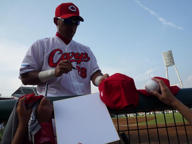 市内中心にあった旧広島市民球場から少し離れてアクセス面ではマイナスになったけど、球場はとても綺麗で、グランドも見やすくなっています。この日は内野砂かぶり席で観戦。試合前の練習では、選手がすぐ目の前を通って、声をかけると、反応してくれる選手もいます。少し時間があるときは、子どもにサインもしてくれます。この日は廣瀬選手がサインしてくれました。