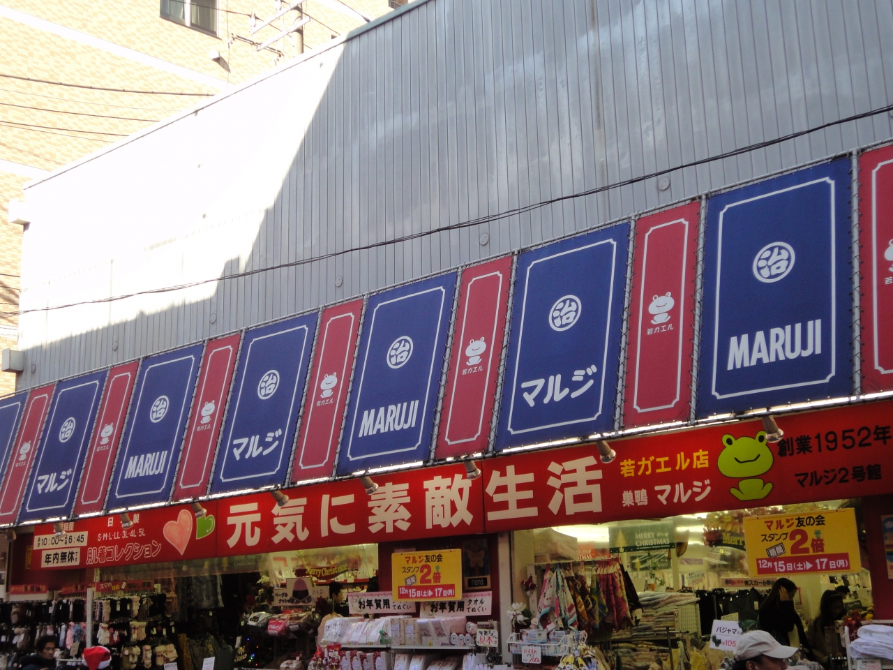 巣鴨商店街でも、おなじみのマルジ衣料品店。3つ?くらい?お店が並んでいて、全部マルジさんのようです。まわりでも、おばさんが「マルジ入る?なんでも安いよ」とかお友達の方と話しています。本当に、おなじみのようです。赤パンツのお店も楽しいですが、靴下とかいろいろあって安いので、どなたでも利用できると思います。